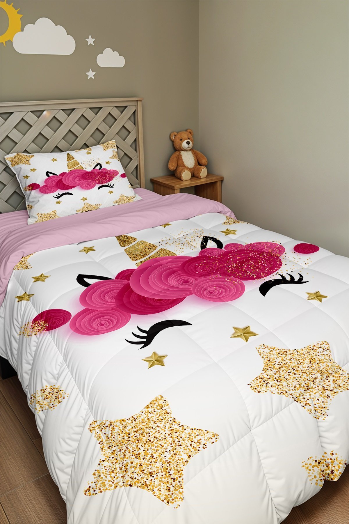 Altın Yıldızlı Unicorn Desenli Tek Kişilik Yorgan ve Yastık Kılıfı