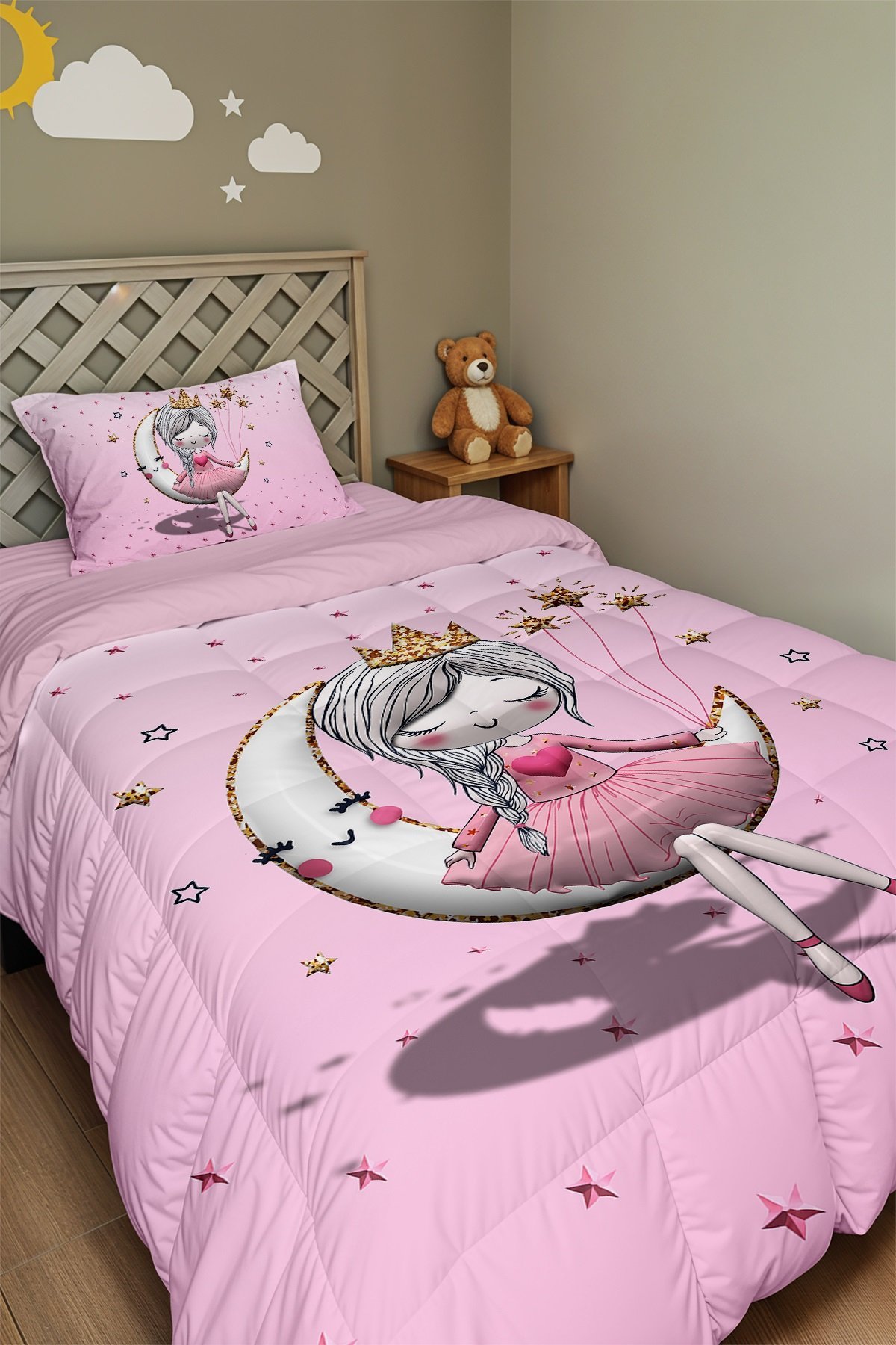 3 Boyutlu Pembe Ayda Oturan Prenses Desenli Tek Kişilik Yorgan ve Yastık Kılıfı