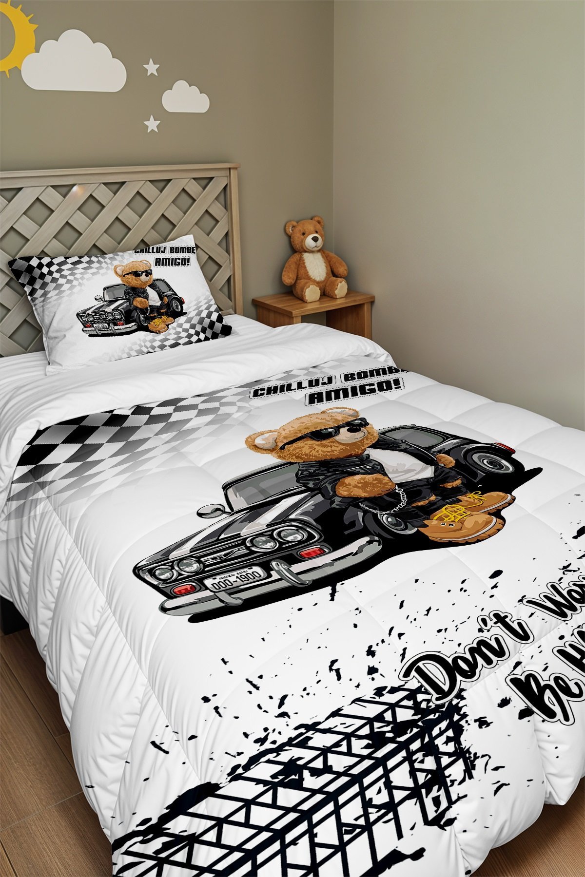Arabalı Ayı Teddy Desenli Tek Kişilik Yorgan ve Yastık Kılıfı