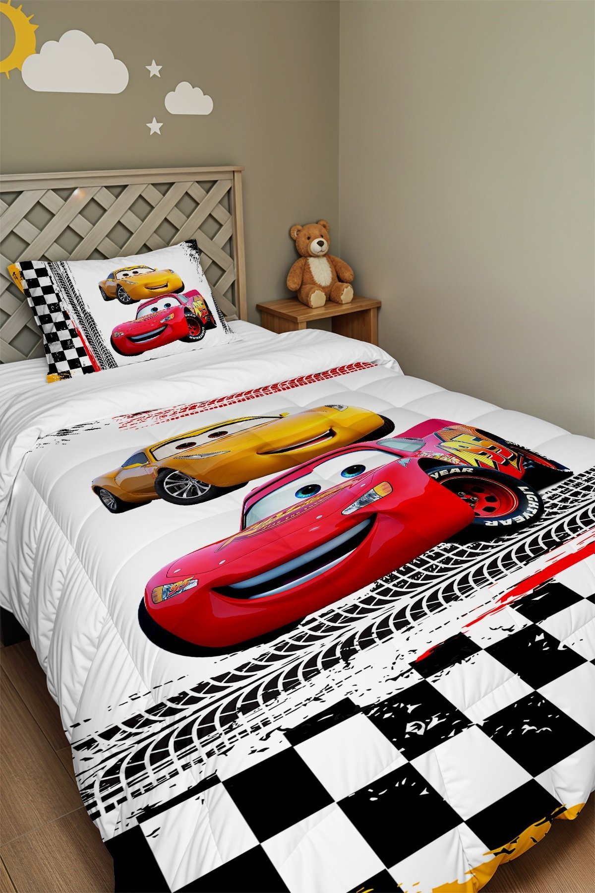 Damalı Mcqueen Desenli Tek Kişilik Yorgan ve Yastık Kılıfı