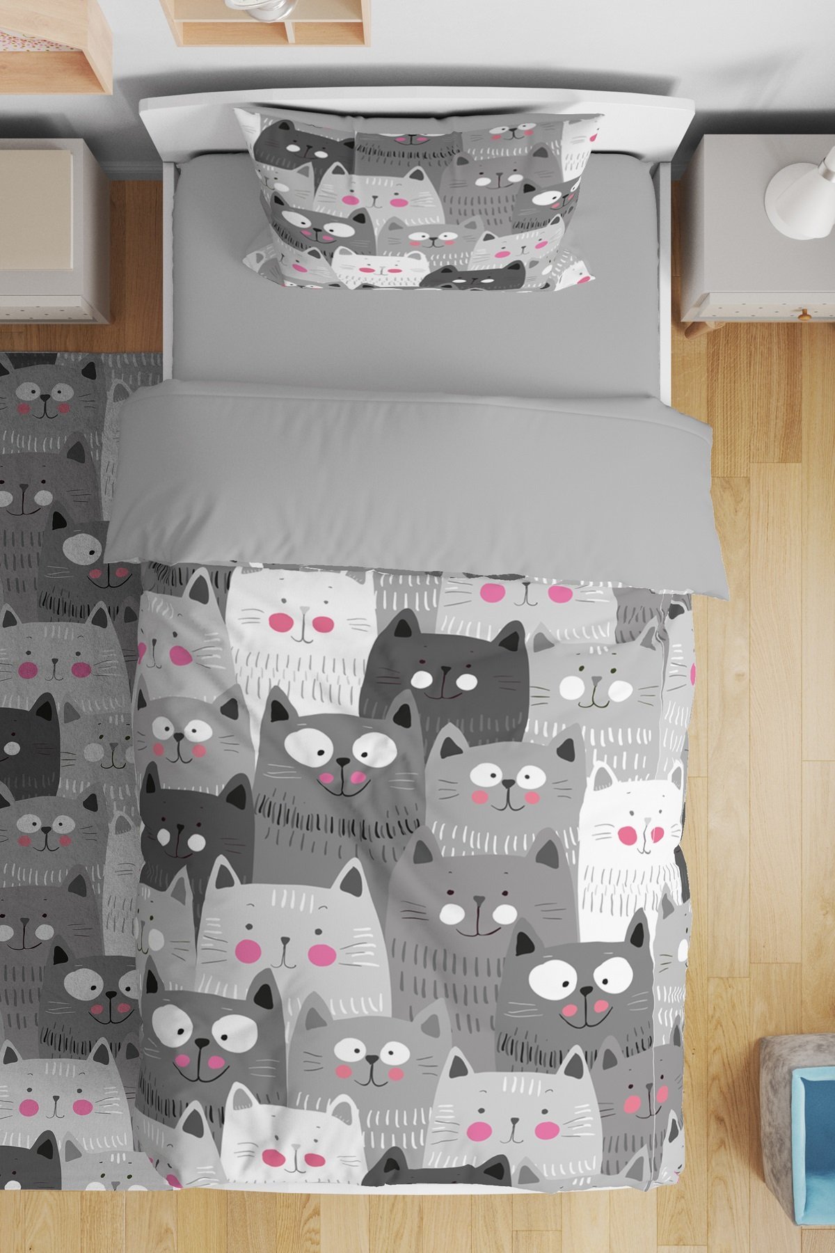 Gri Kediler Desenli Tek Kişilik Bebek Çocuk Nevresim Takımı
