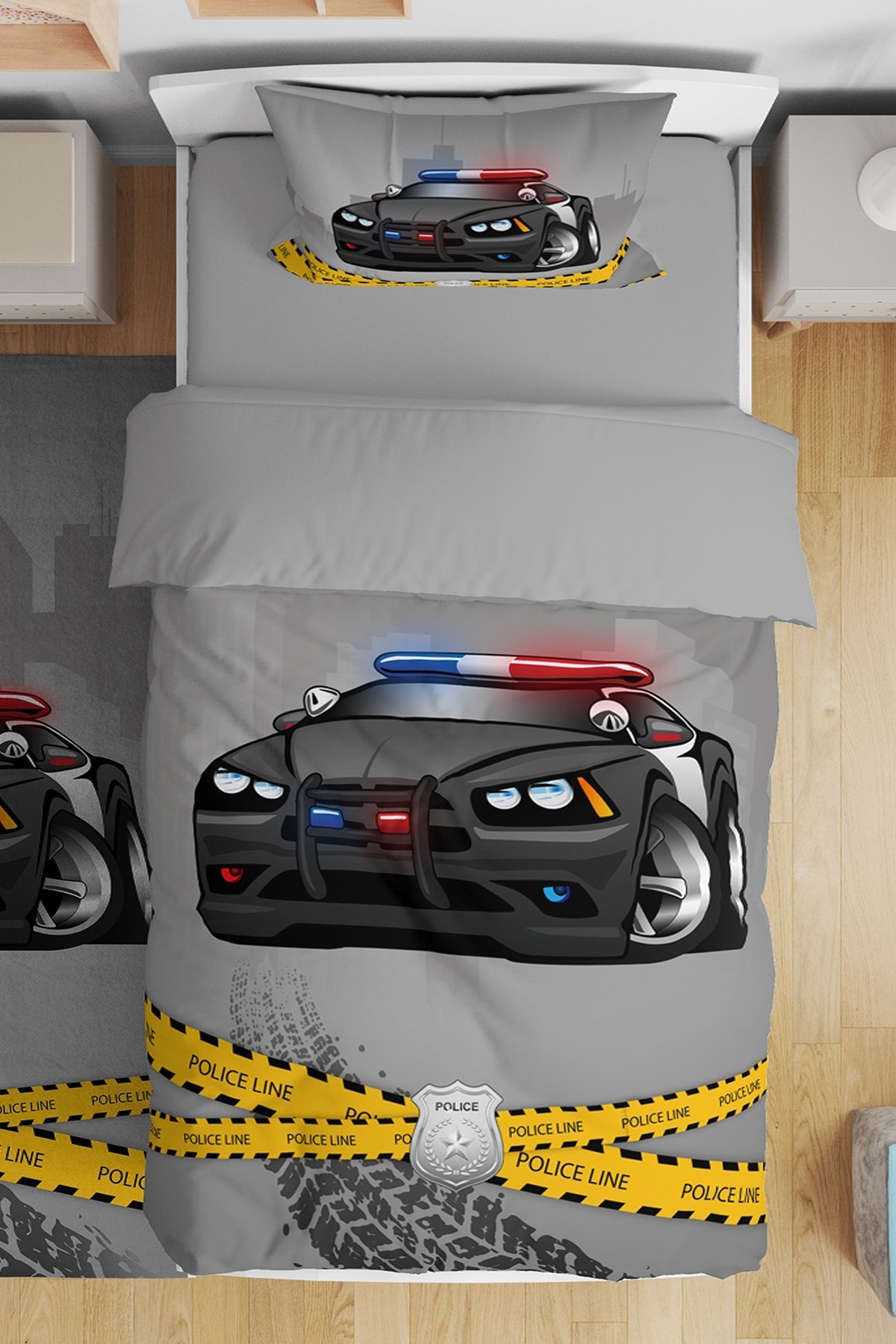 Gri Polis Aracı Desenli Tek Kişilik Bebek Çocuk Nevresim Seti