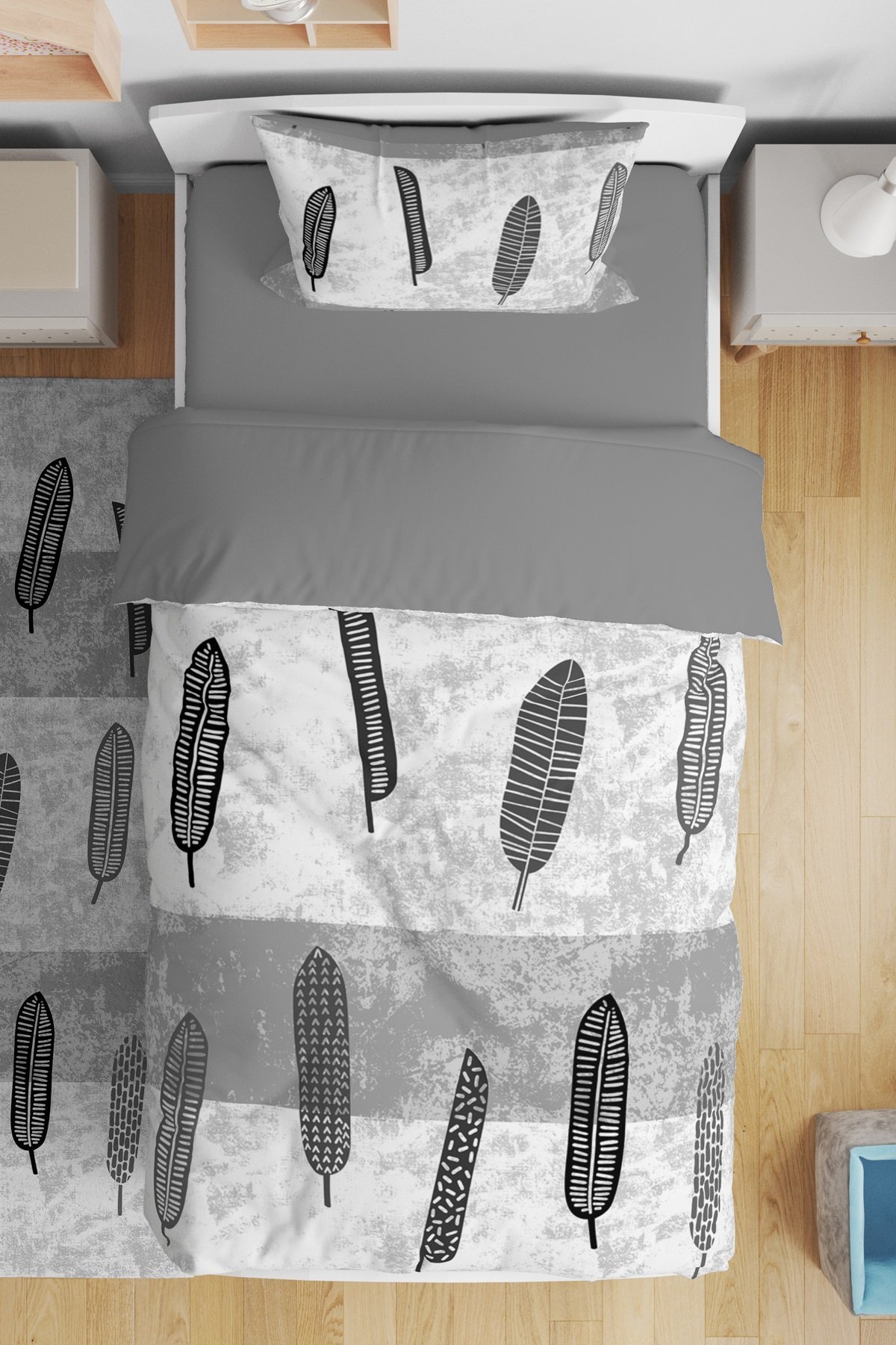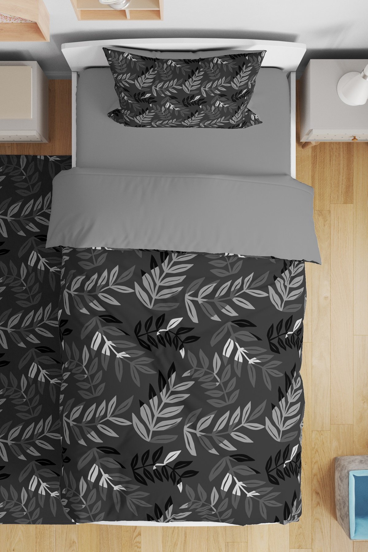 Gri Yapraklar Desenli Tek Kişilik Bebek Çocuk Nevresim Takımı
