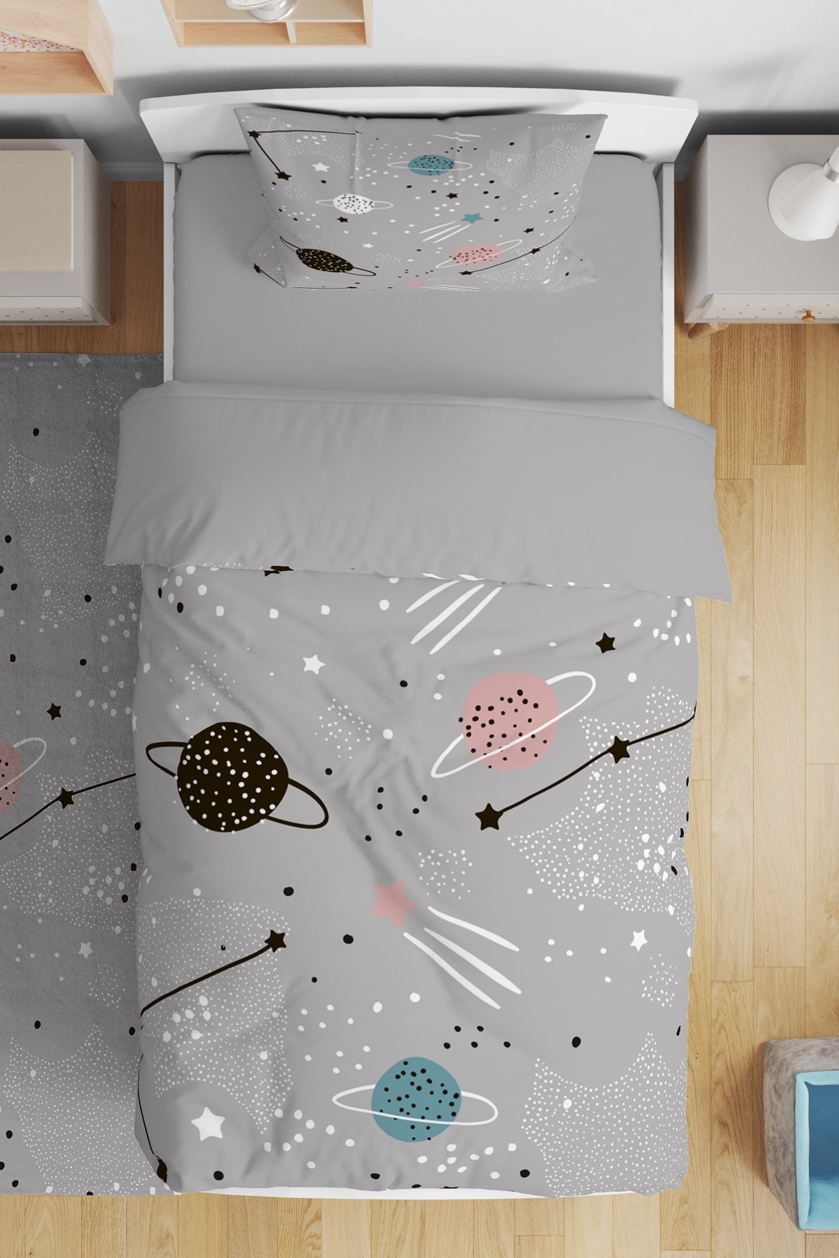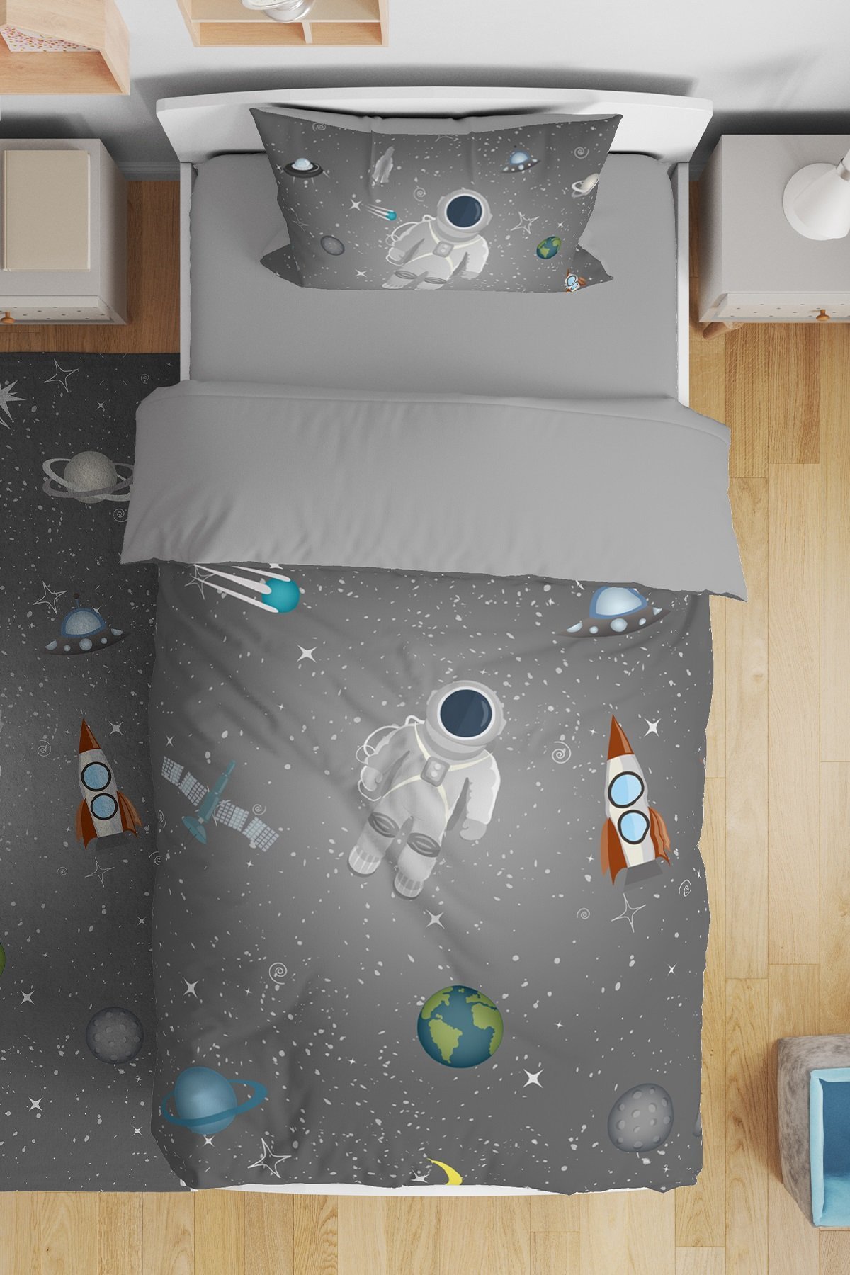Gri Uzay Desenli Tek Kişilik Bebek Çocuk Nevresim Takımı