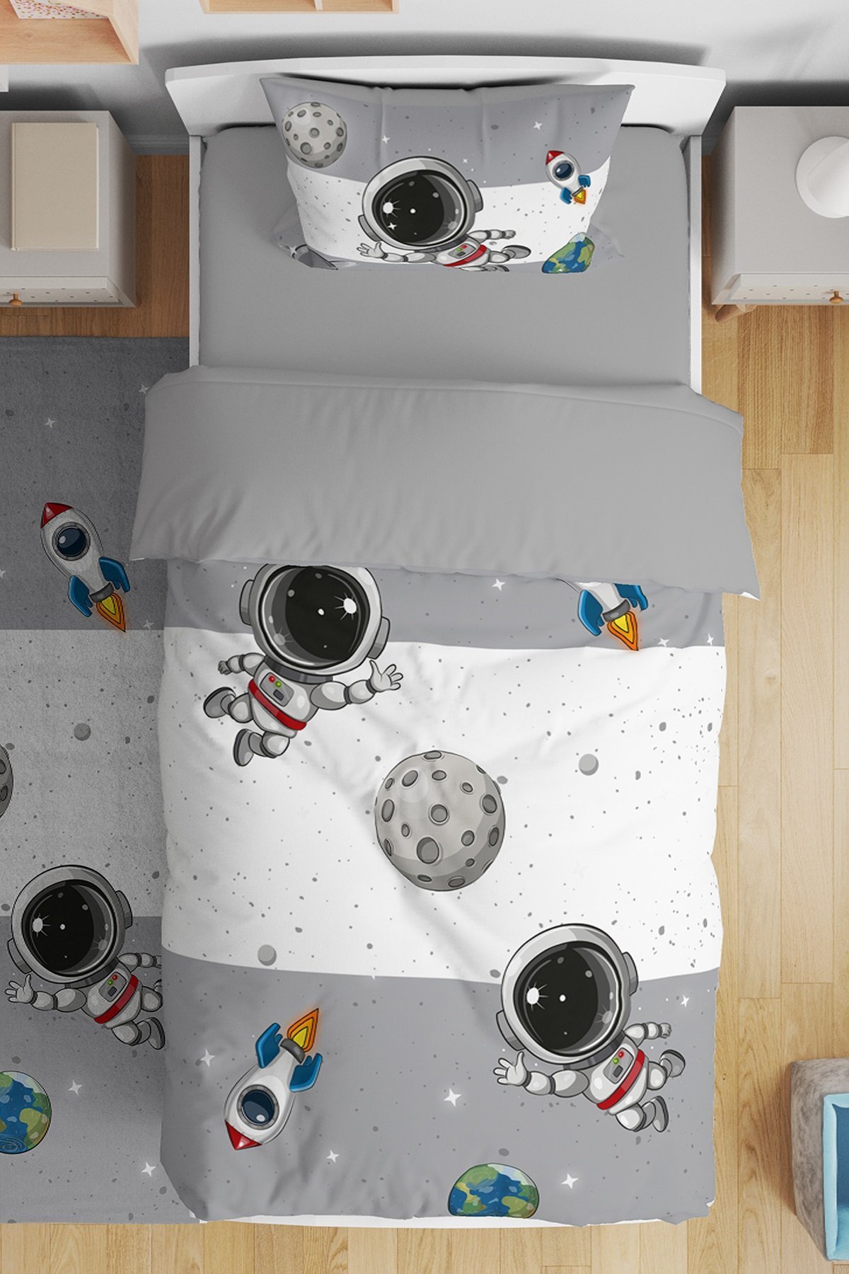 Gri Uzay ve Minik Astonot Desenli Tek Kişilik Bebek Çocuk Nevresim Seti