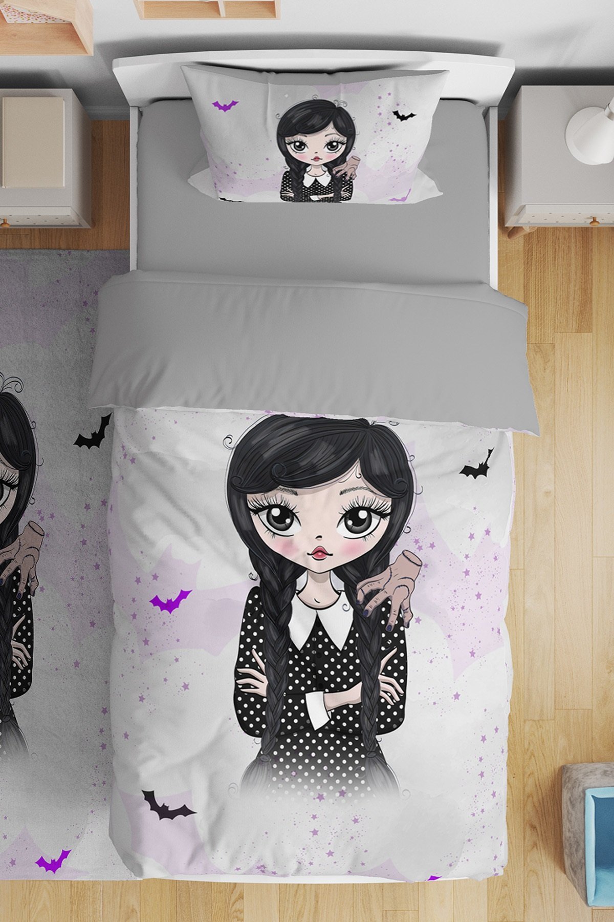 Gri Wednesday Addams Desenli Tek Kişilik Bebek Çocuk Nevresim Takımı