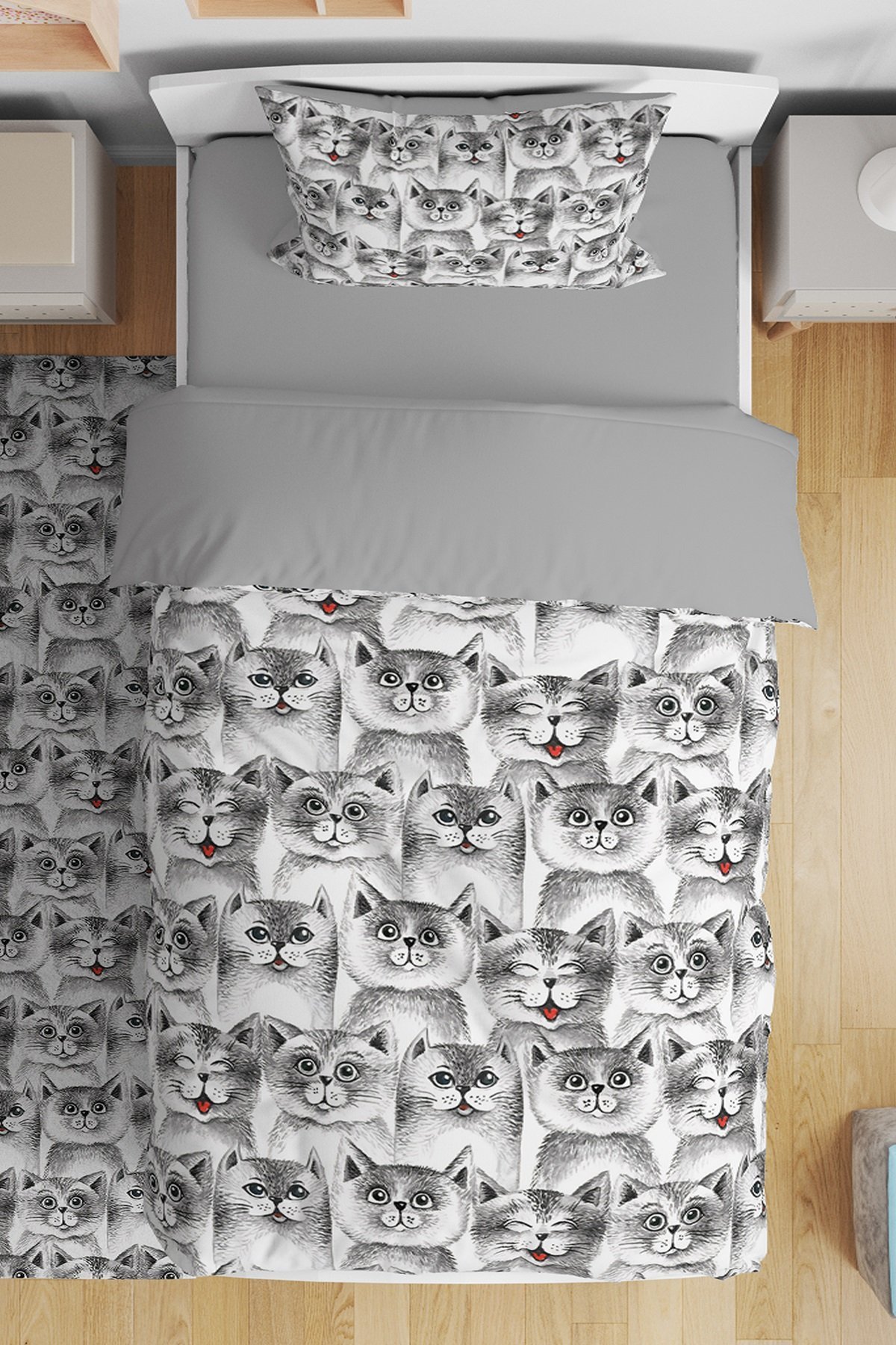 Gri Sevimli Kediler Desenli Tek Kişilik Bebek Çocuk Nevresim Seti