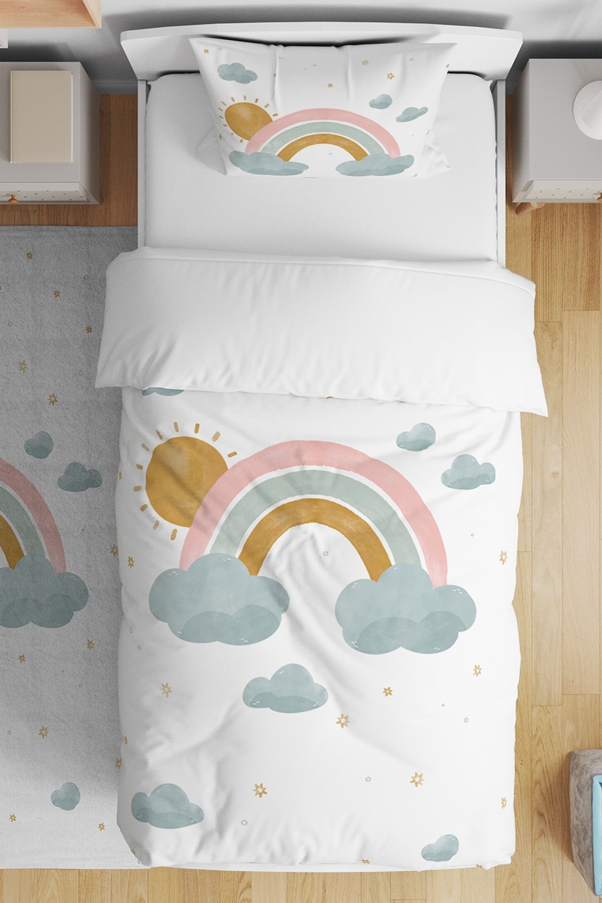 Güneş ve Gökkuşağı Desenli Tek Kişilik Bebek Çocuk Nevresim Seti