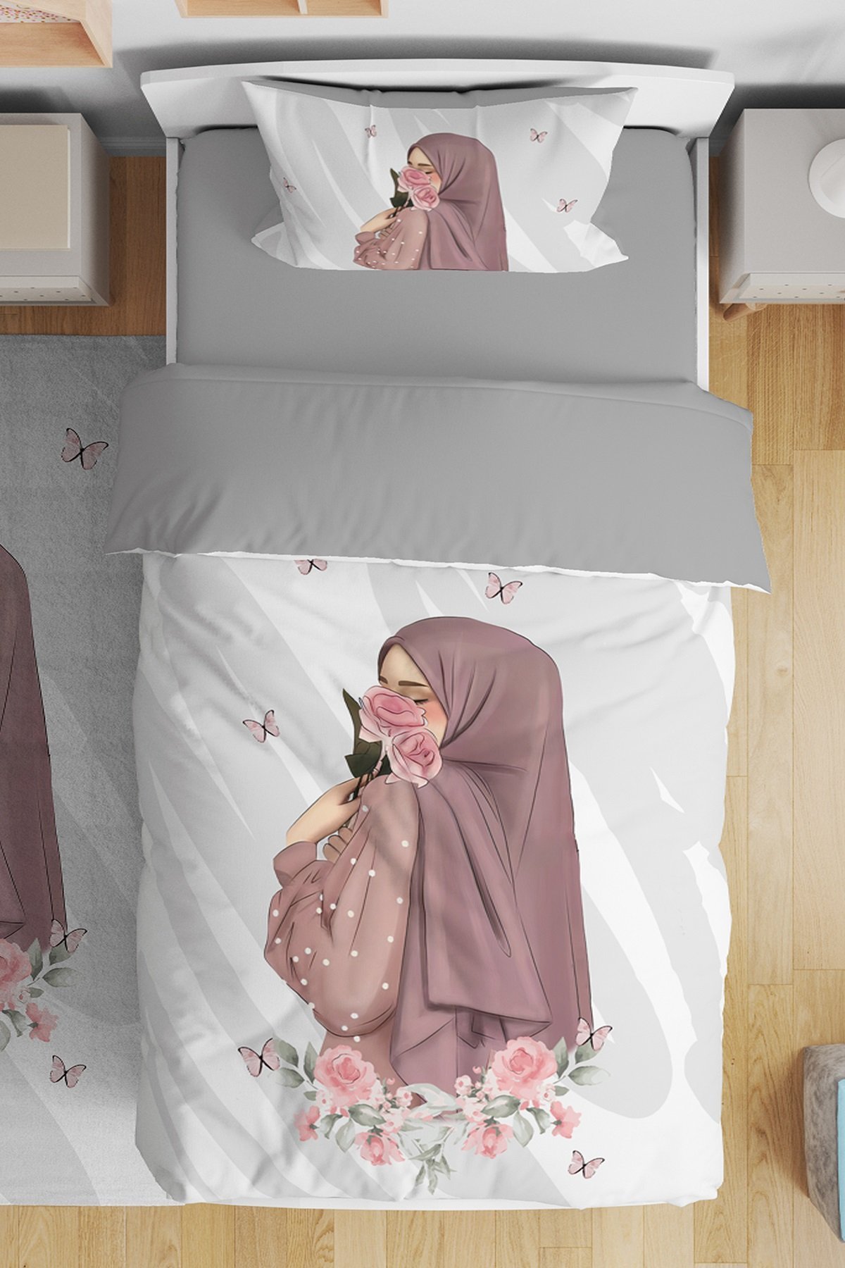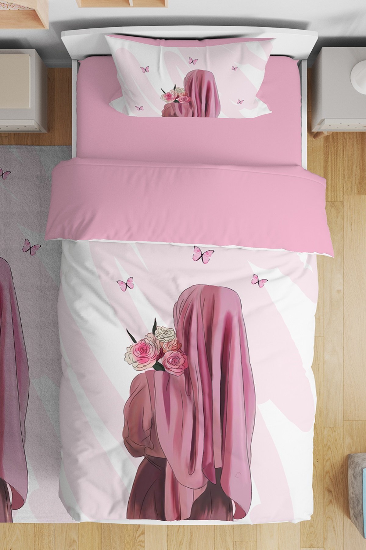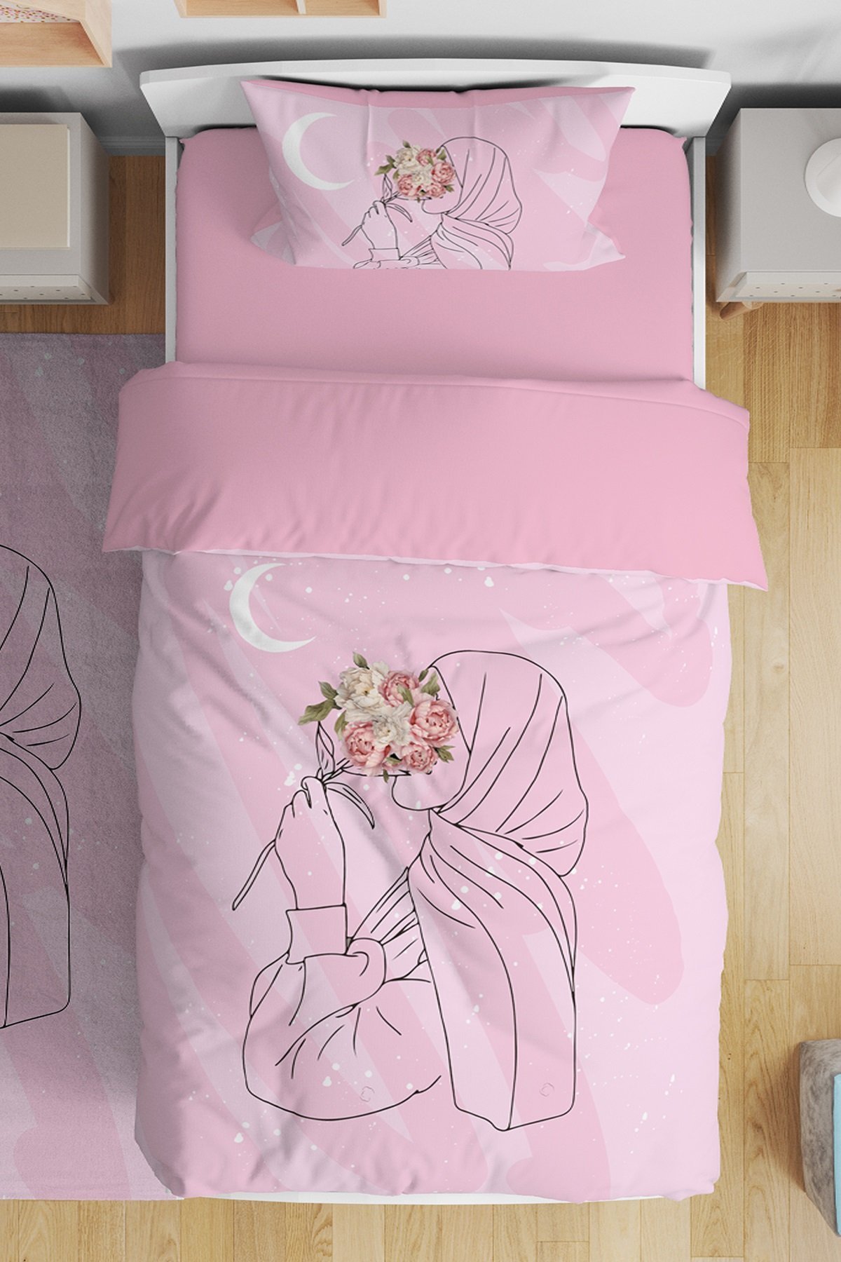 Güllü Kız Silüeti Desenli Tek Kişilik Bebek Çocuk Nevresim Seti