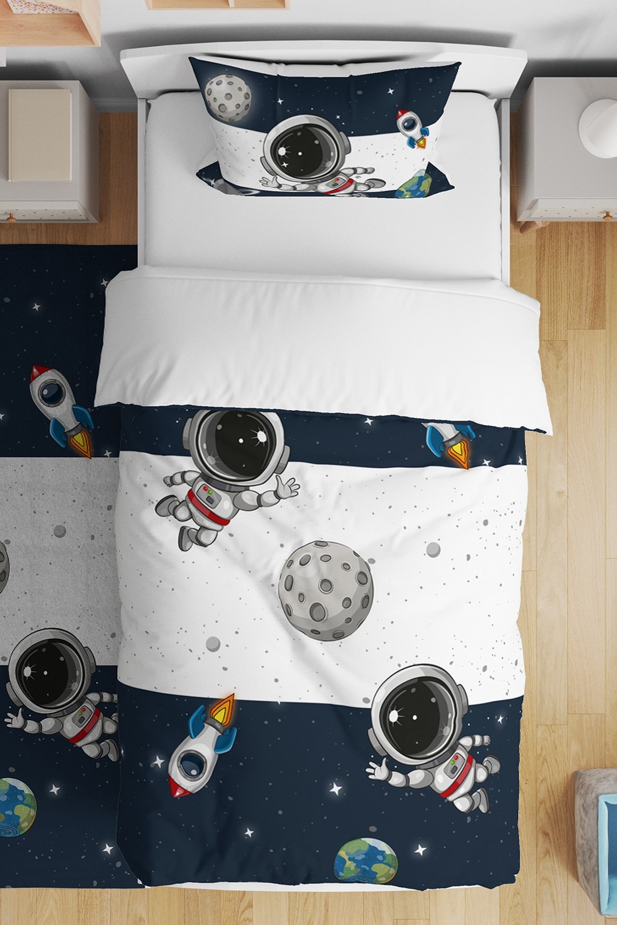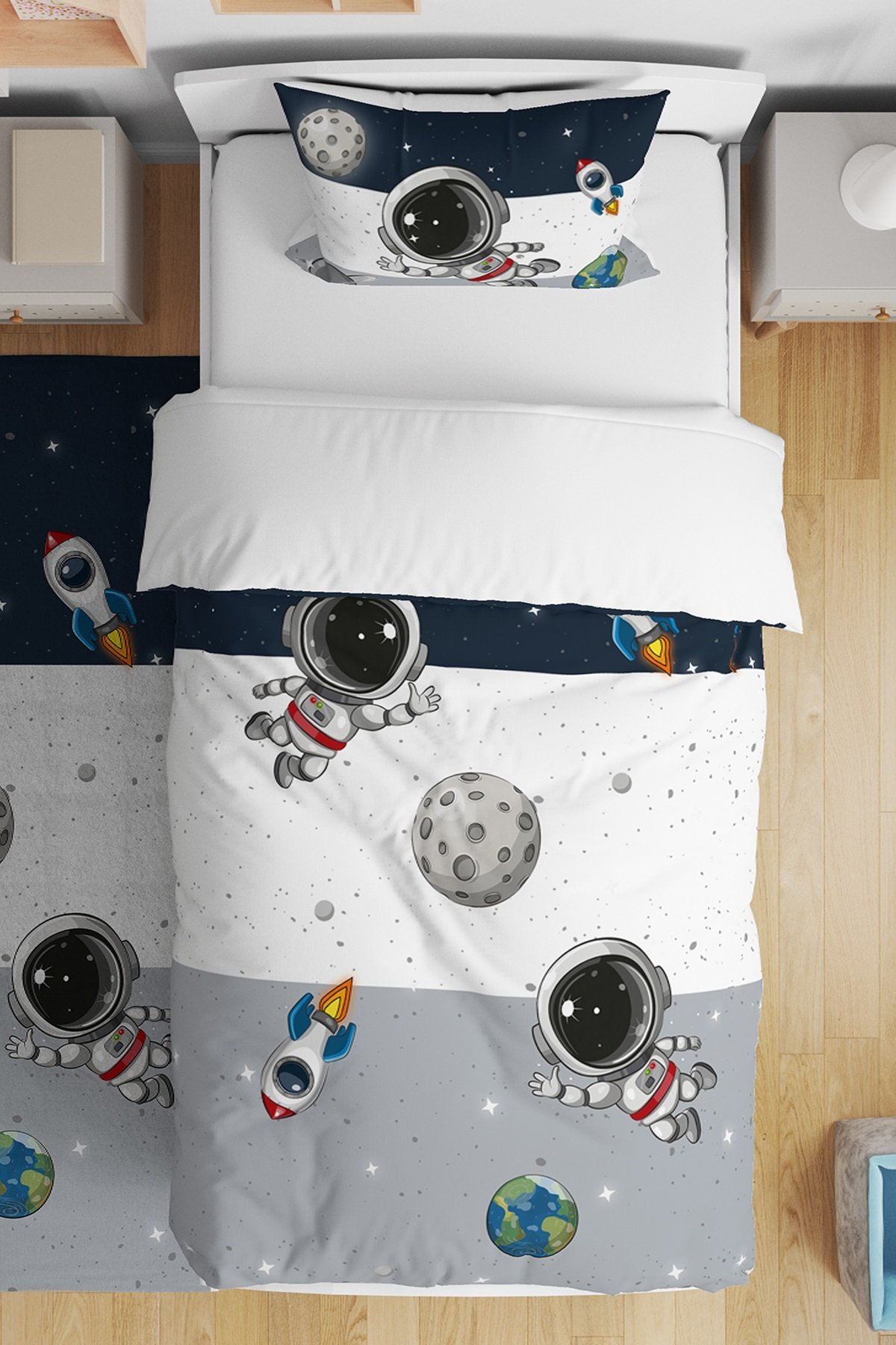 Lacivert Gri Uzay ve Minik Astonot Desenli Tek Kişilik Bebek Çocuk Nevresim Seti