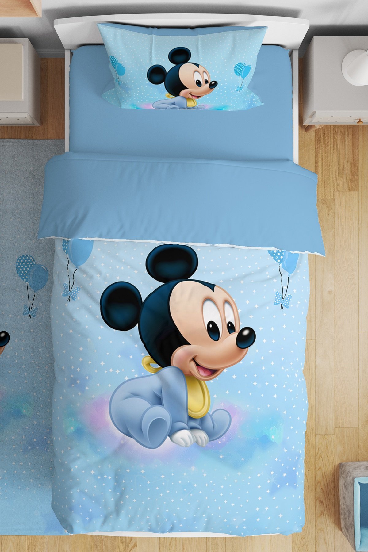 Mavi Mickey Desenli Tek Kişilik Bebek Çocuk Nevresim Takımı