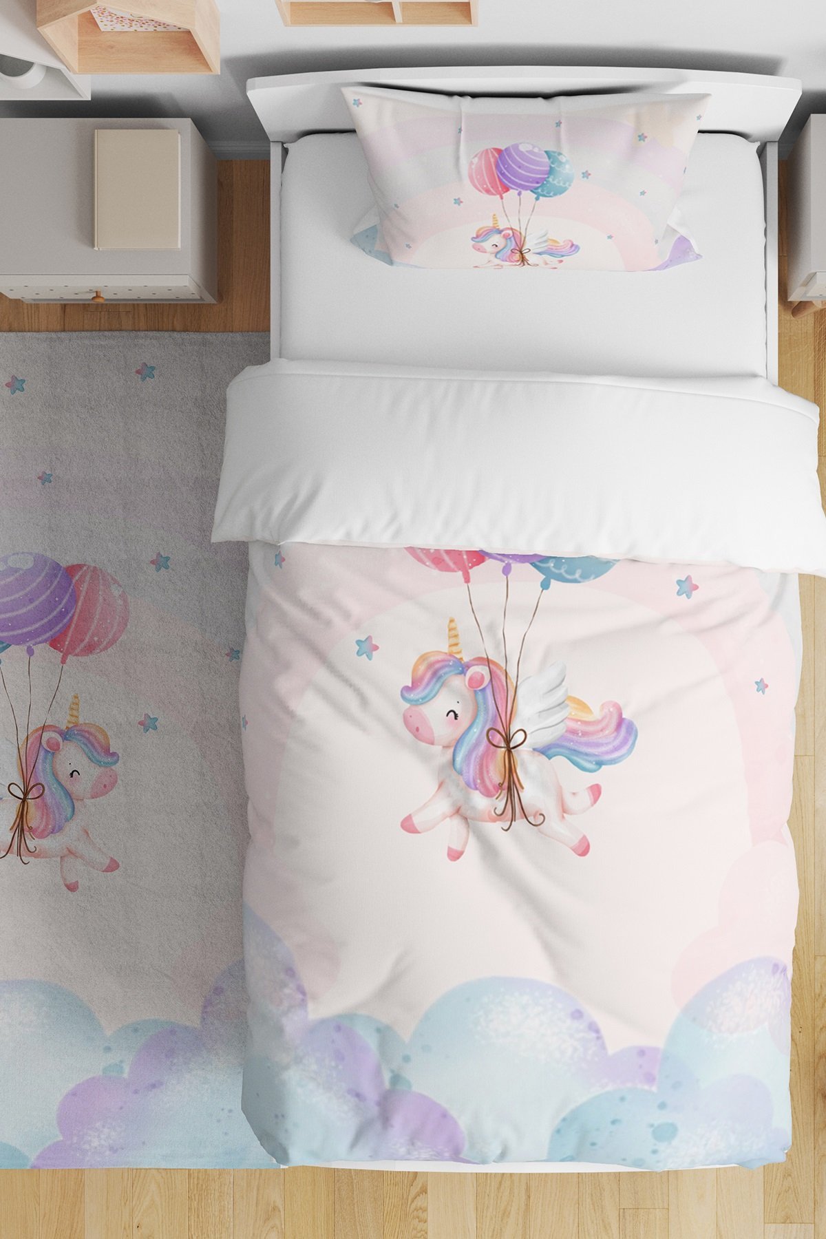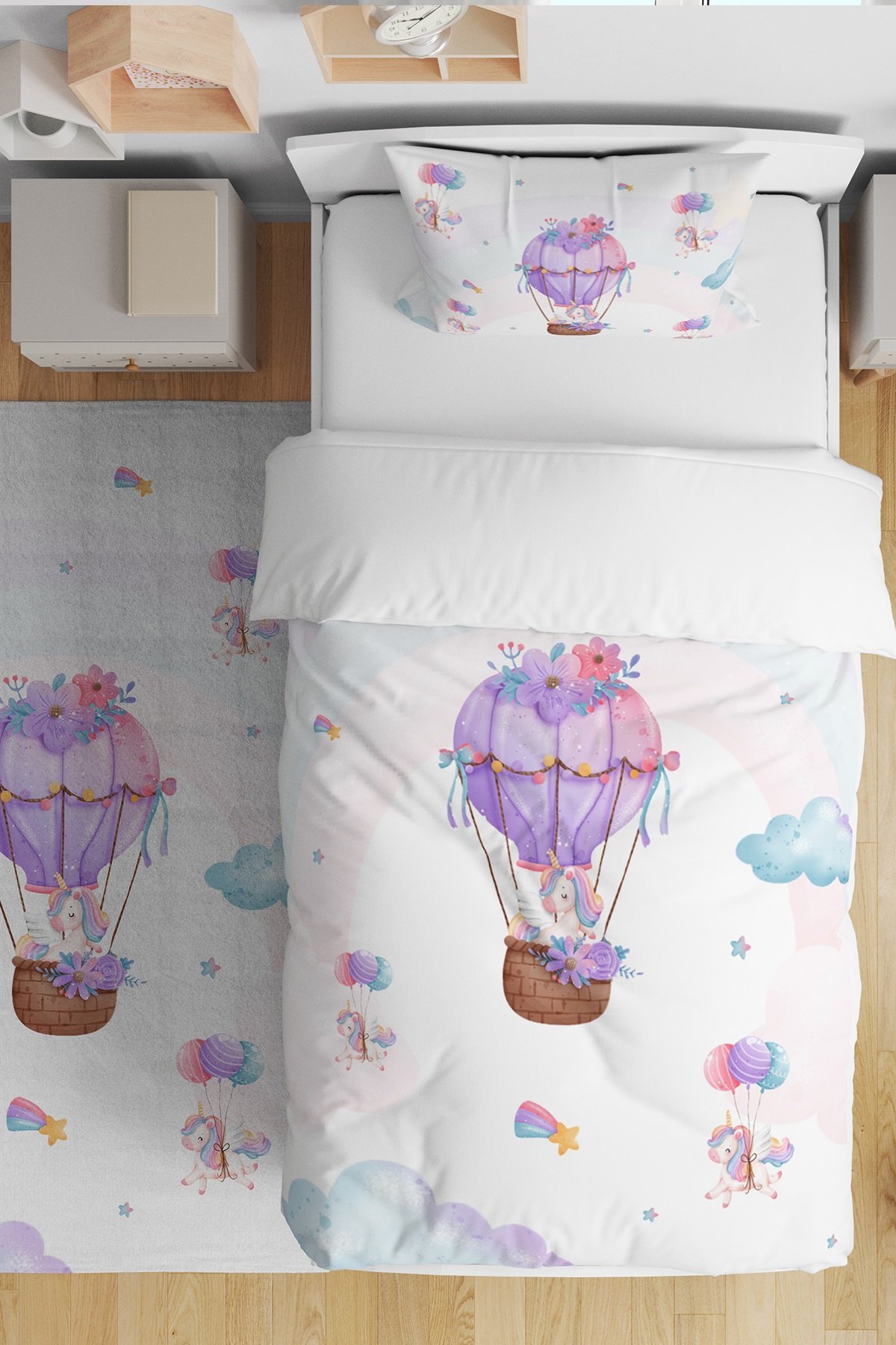 Balonla Uçan Unicorn Desenli Tek Kişilik Bebek Çocuk Nevresim Seti
