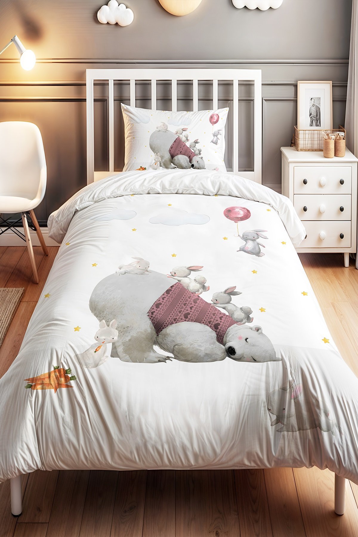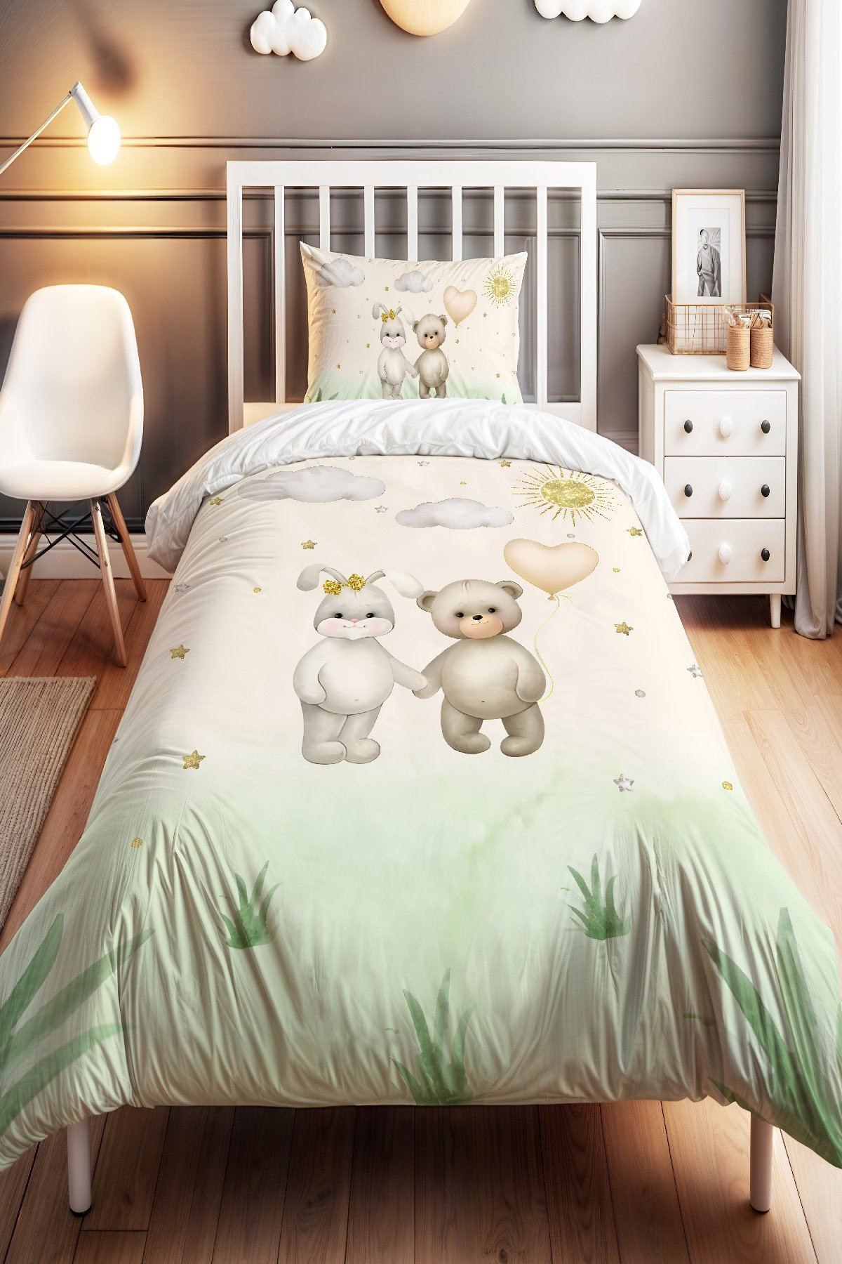 Ayı ve Tavşan Kardeş Desenli Tek Kişilik Bebek Çocuk Nevresim Seti