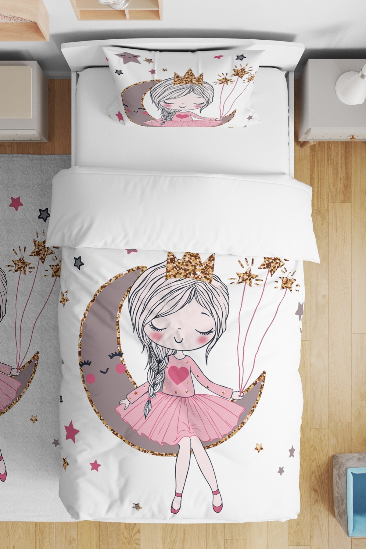 Beyaz Ay Üstündeki Prenses Desenli Tek Kişilik Bebek Çocuk Nevresim Takımı