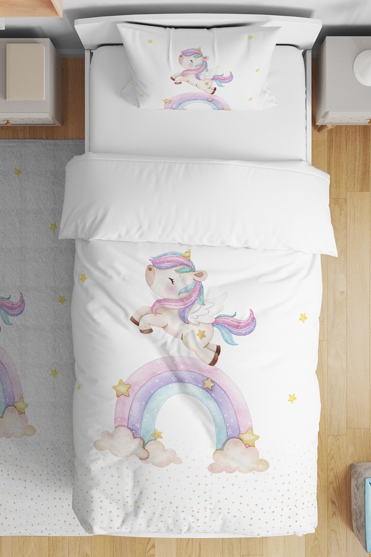 Beyaz Ponçik Unicorn Desenli Tek Kişilik Bebek Çocuk Nevresim Takımı