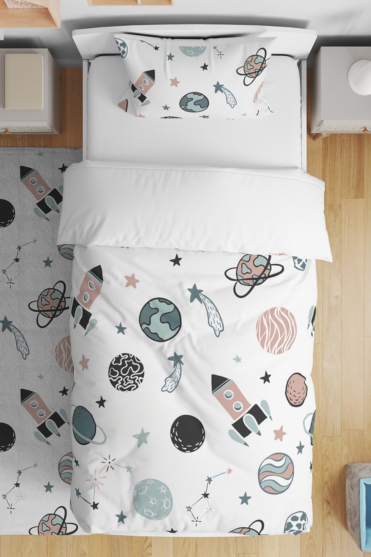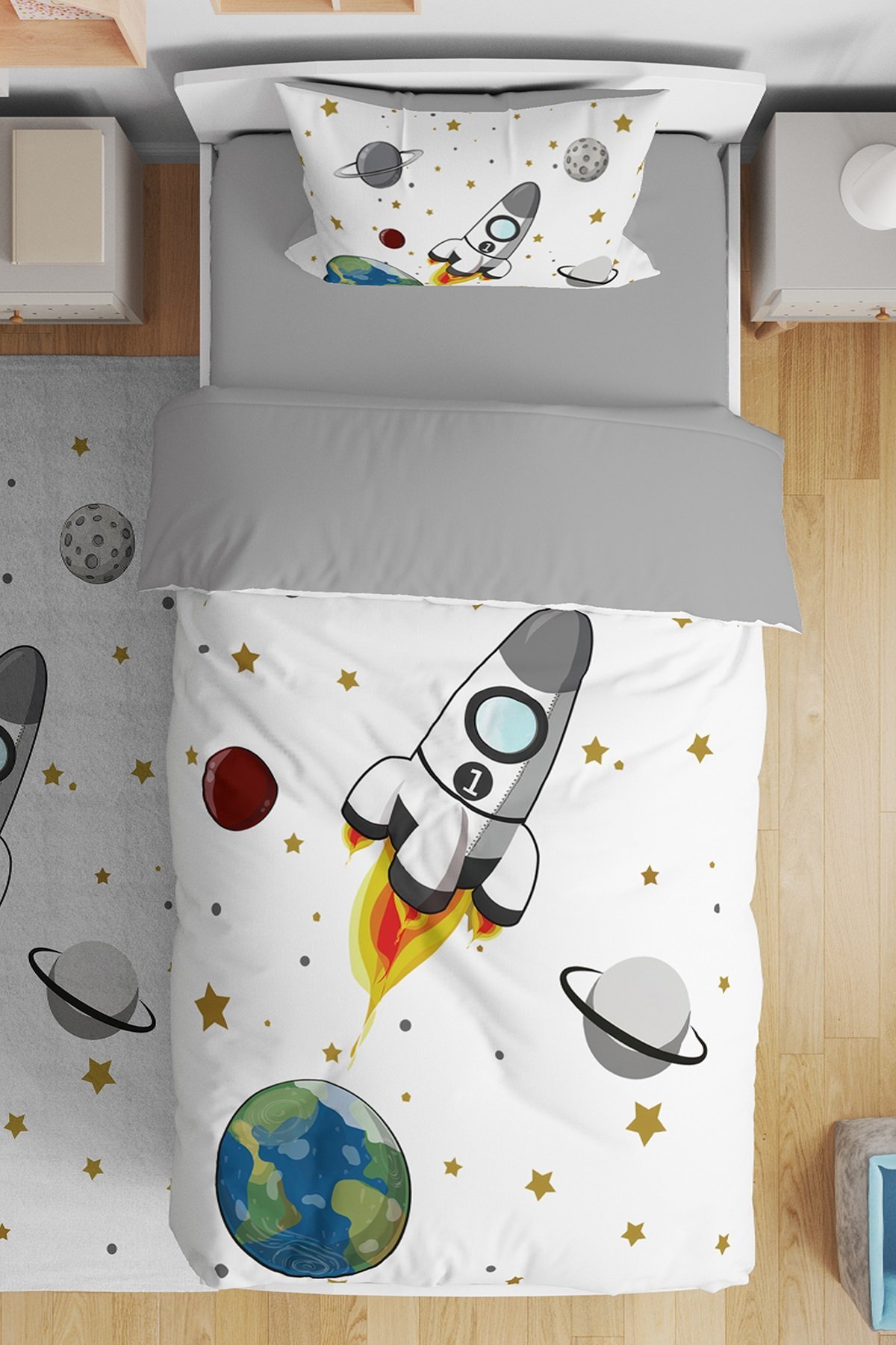 Beyaz Uzay Ve Roket Desenli Tek Kişilik Bebek Çocuk Nevresim Seti