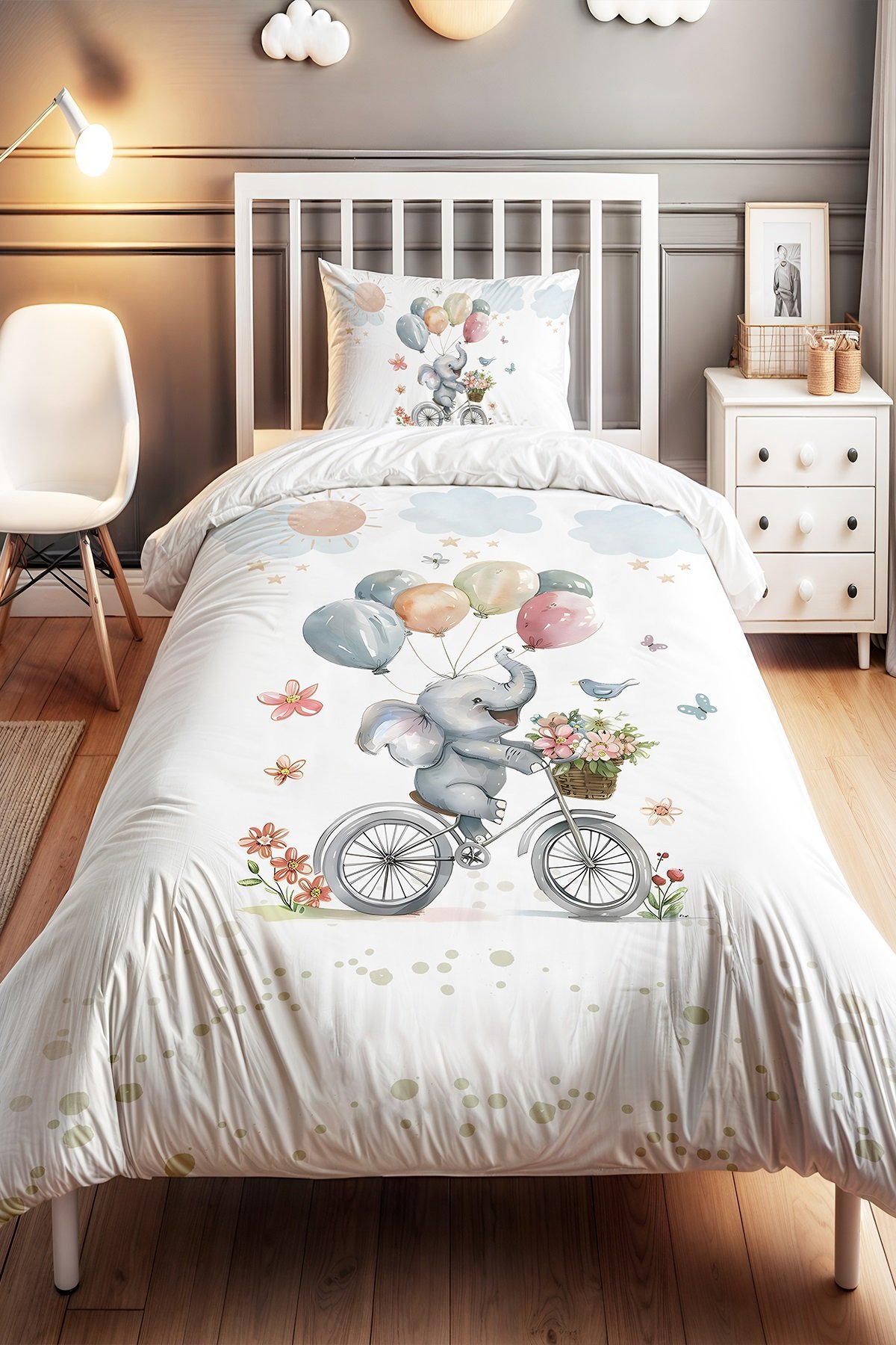 Bisikletli Baloncu Fil Desenli Tek Kişilik Bebek Çocuk Nevresim Seti