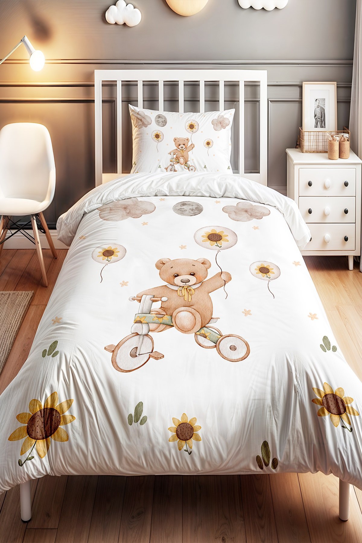 Bisikletli Ayıcık ve Papatyalar Desenli Tek Kişilik Bebek Çocuk Nevresim Seti