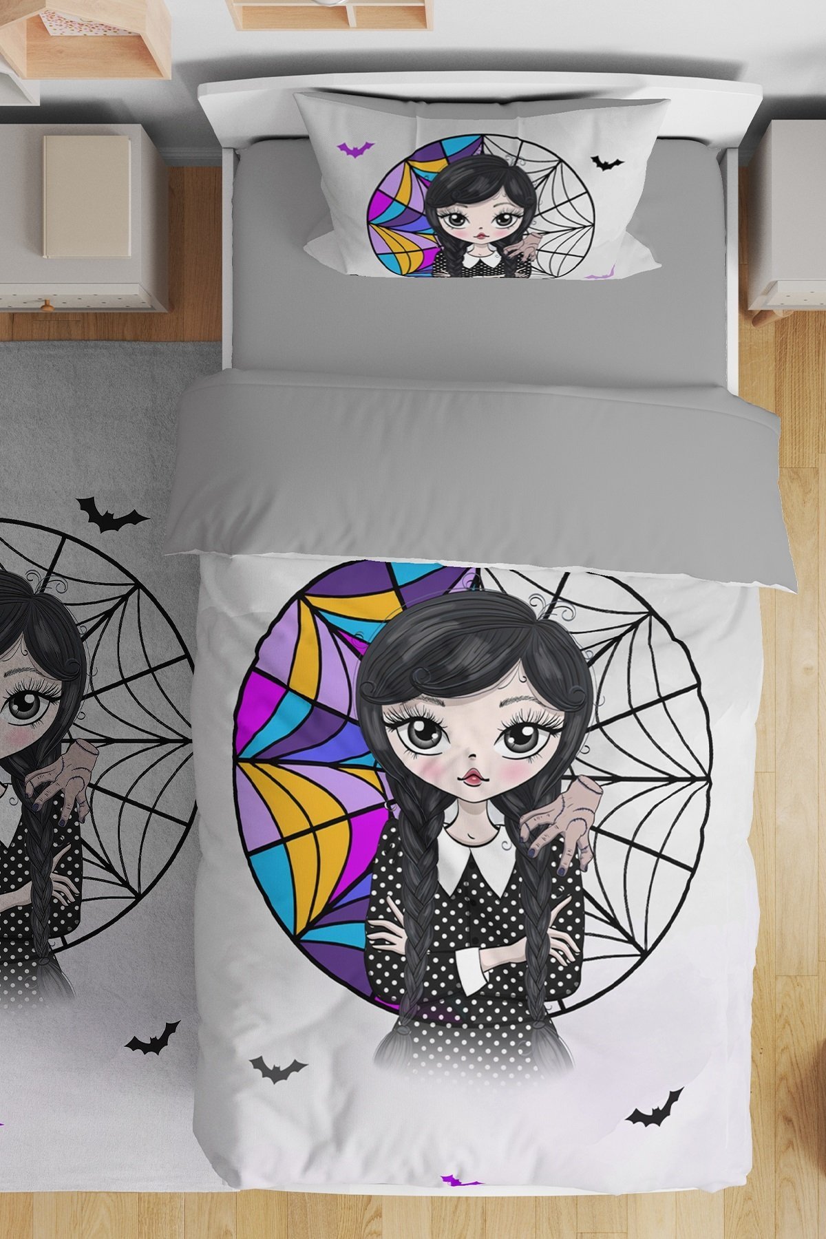 Çizgi Gri Çerçeveli Wednesday Desenli Tek Kişilik Bebek Çocuk Nevresim Seti
