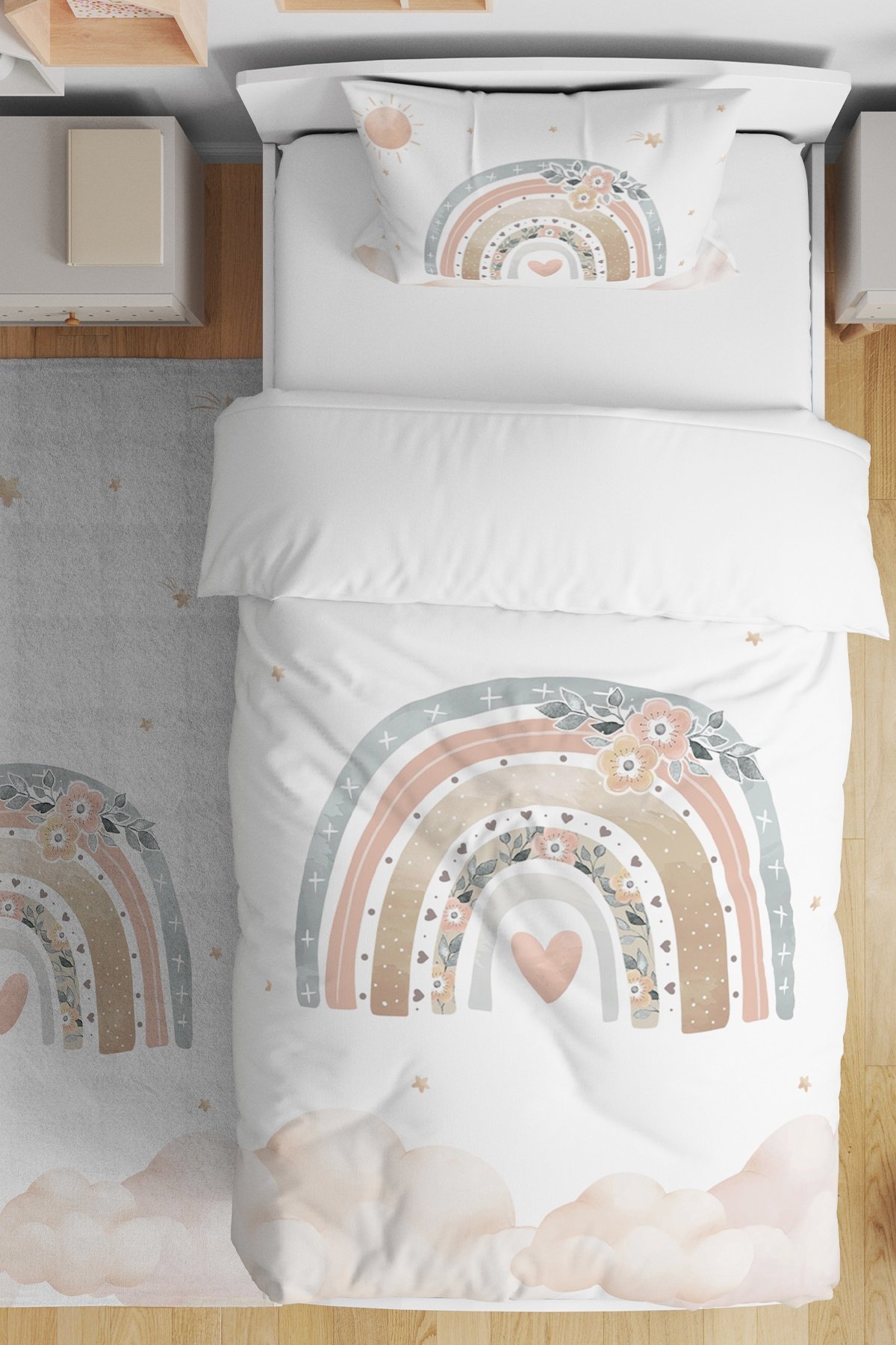 Çiçekten Gökkuşağı Desenli Tek Kişilik Bebek Çocuk Nevresim Seti