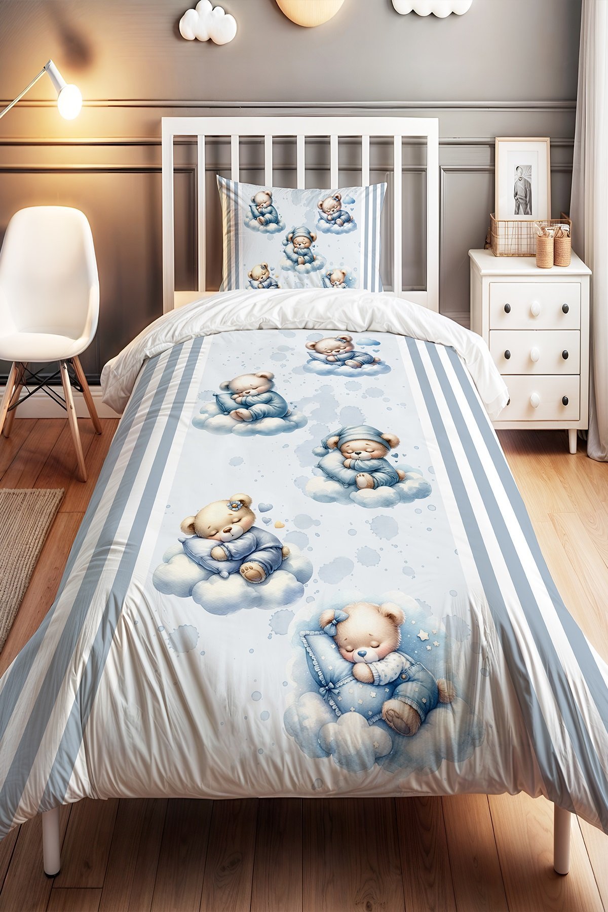 Bulutta Uyuyan Ayıcıklar Desenli Tek Kişilik Bebek Çocuk Nevresim Seti