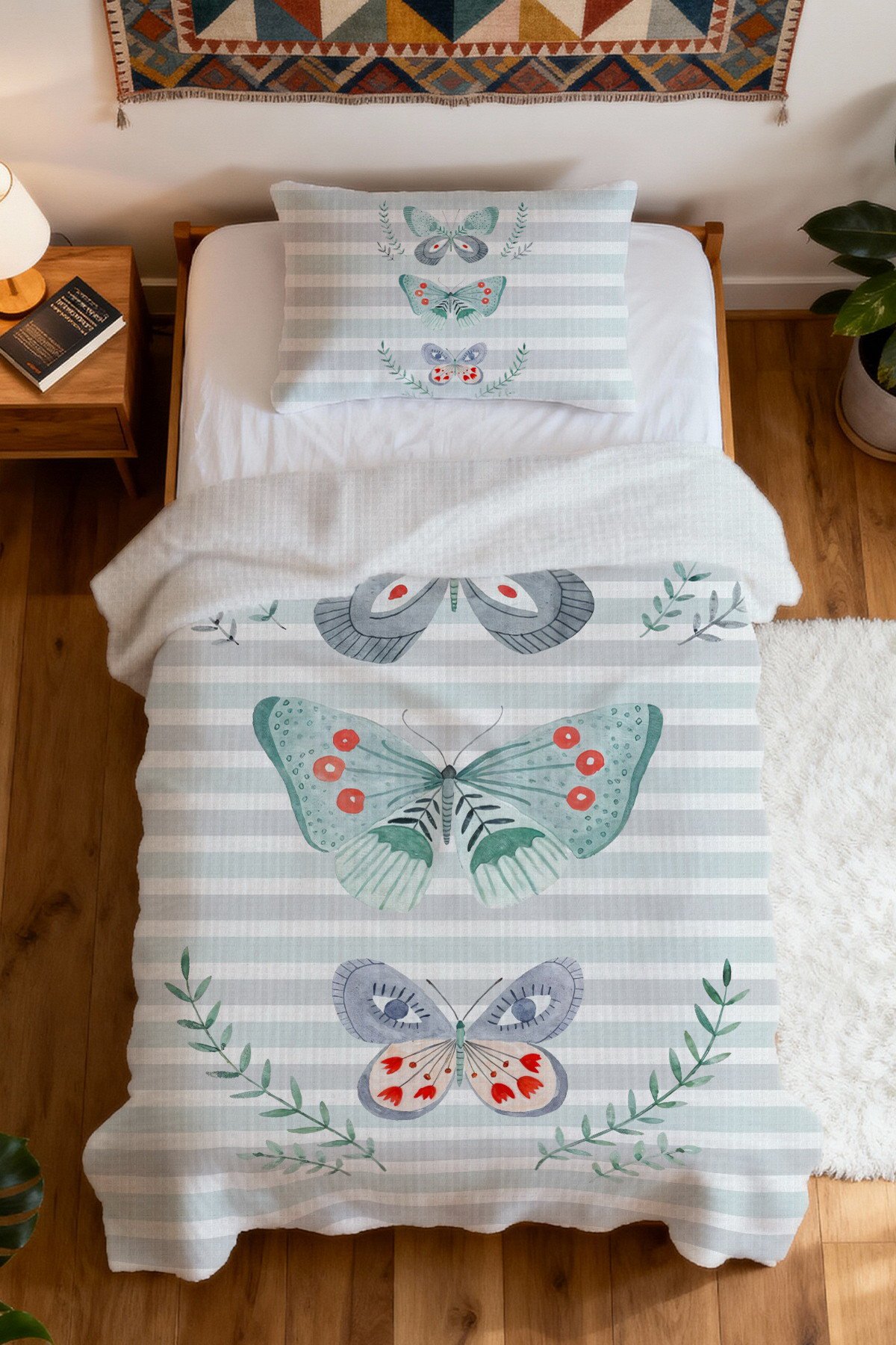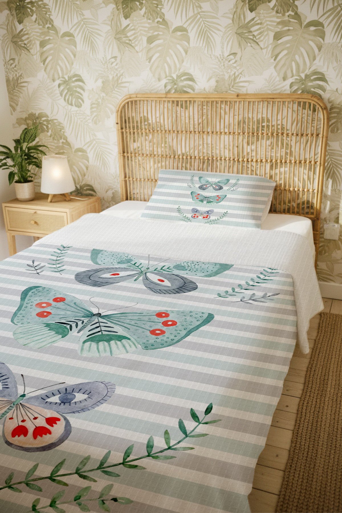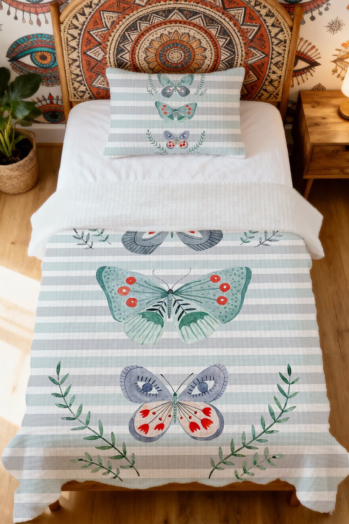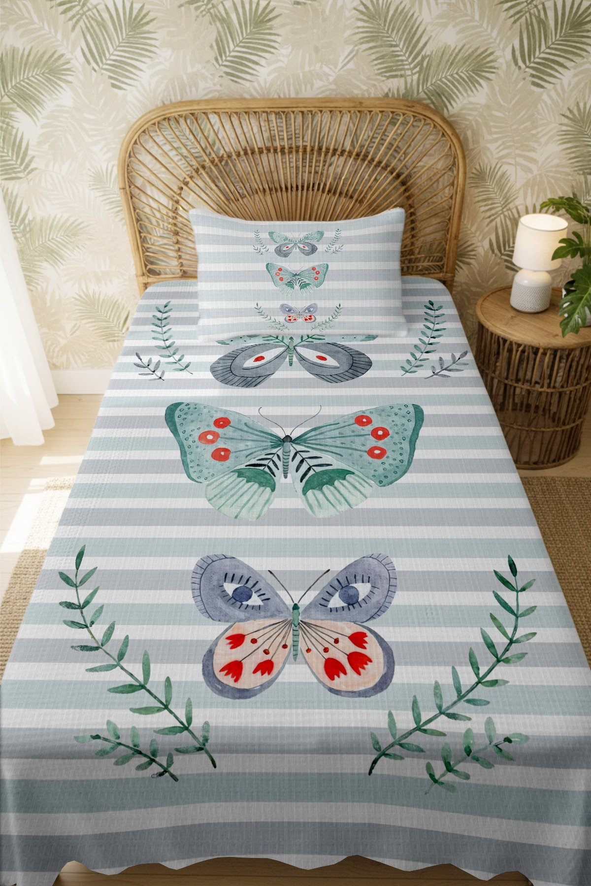 %100 Pamuk Mint Yeşili Kelebek Rüyası Desenli Tek Kişilik Pike Seti