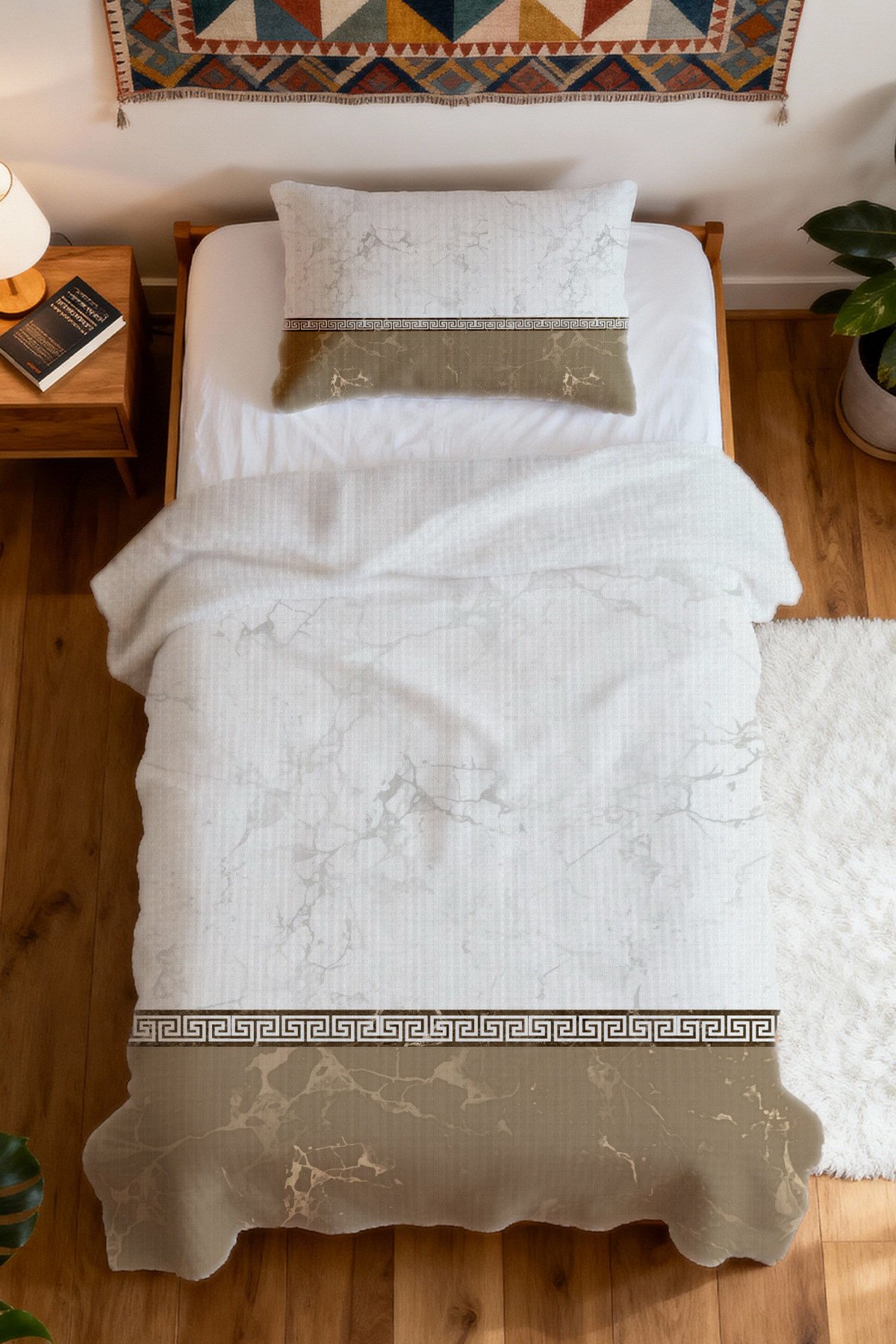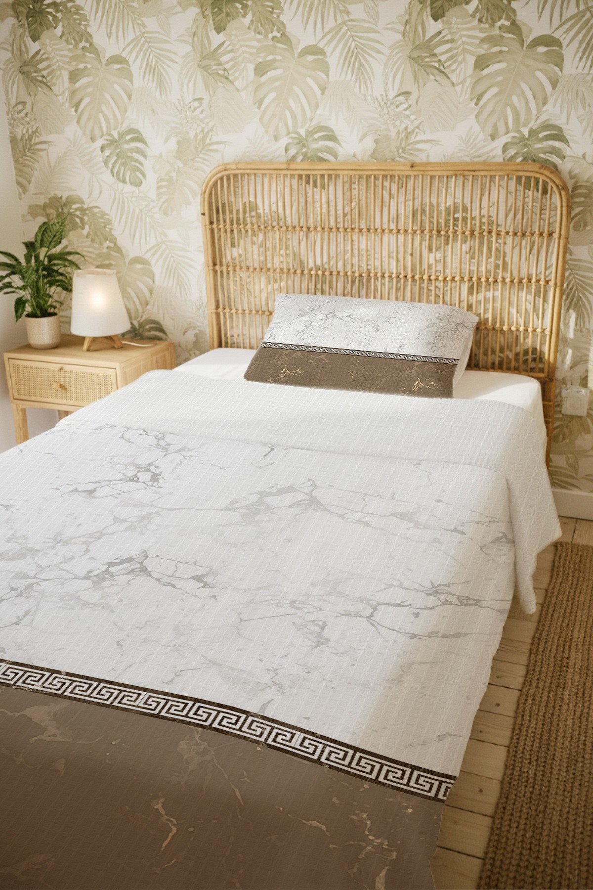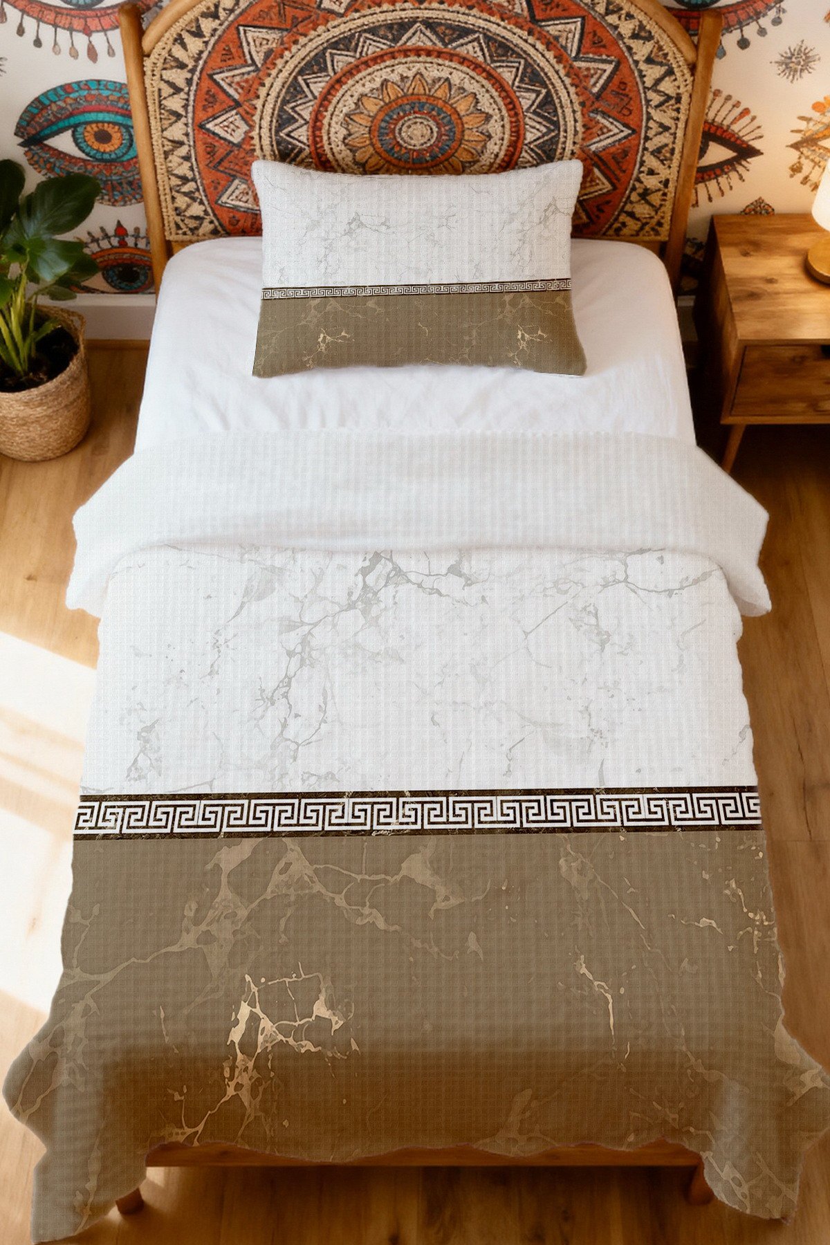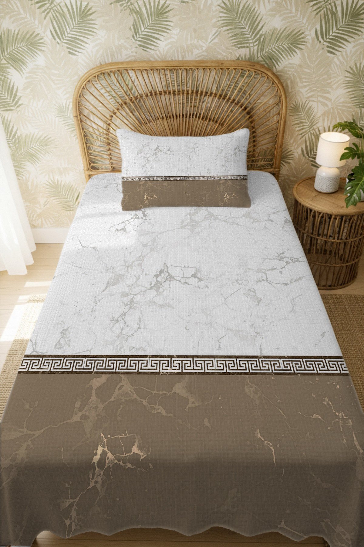 %100 Pamuk Sütlü Kahve Beyaz Mermer Desenli Tek Kişilik Pike Seti