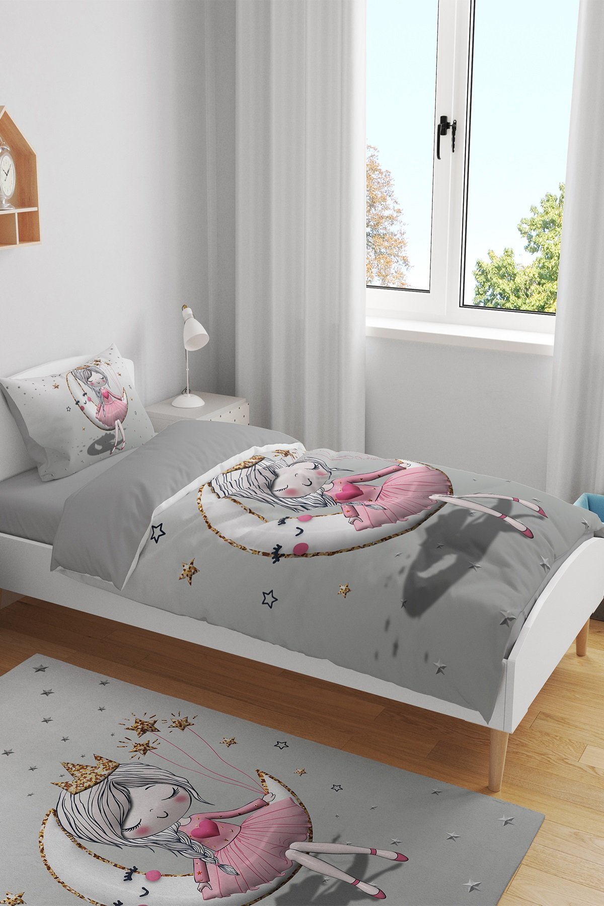 3 BOYUTLU Gri Ayda Oturan Prenses Desenli Tek Kişilik Bebek Çocuk Nevresim Takımı