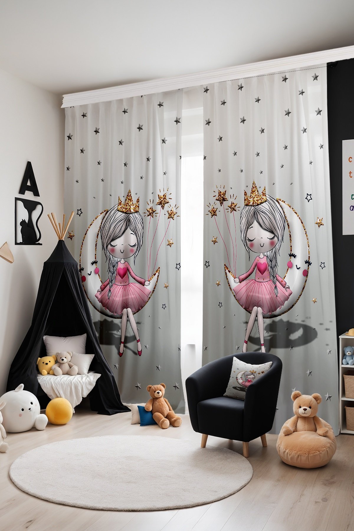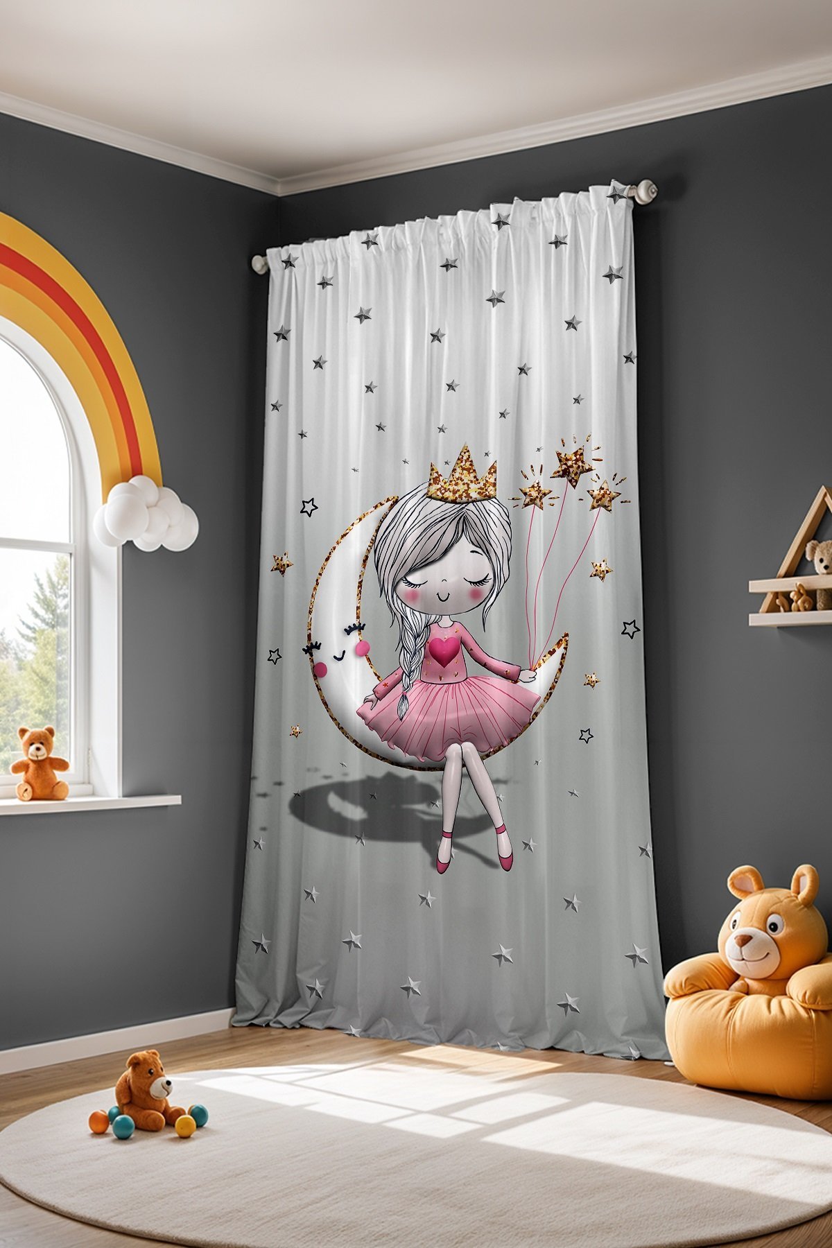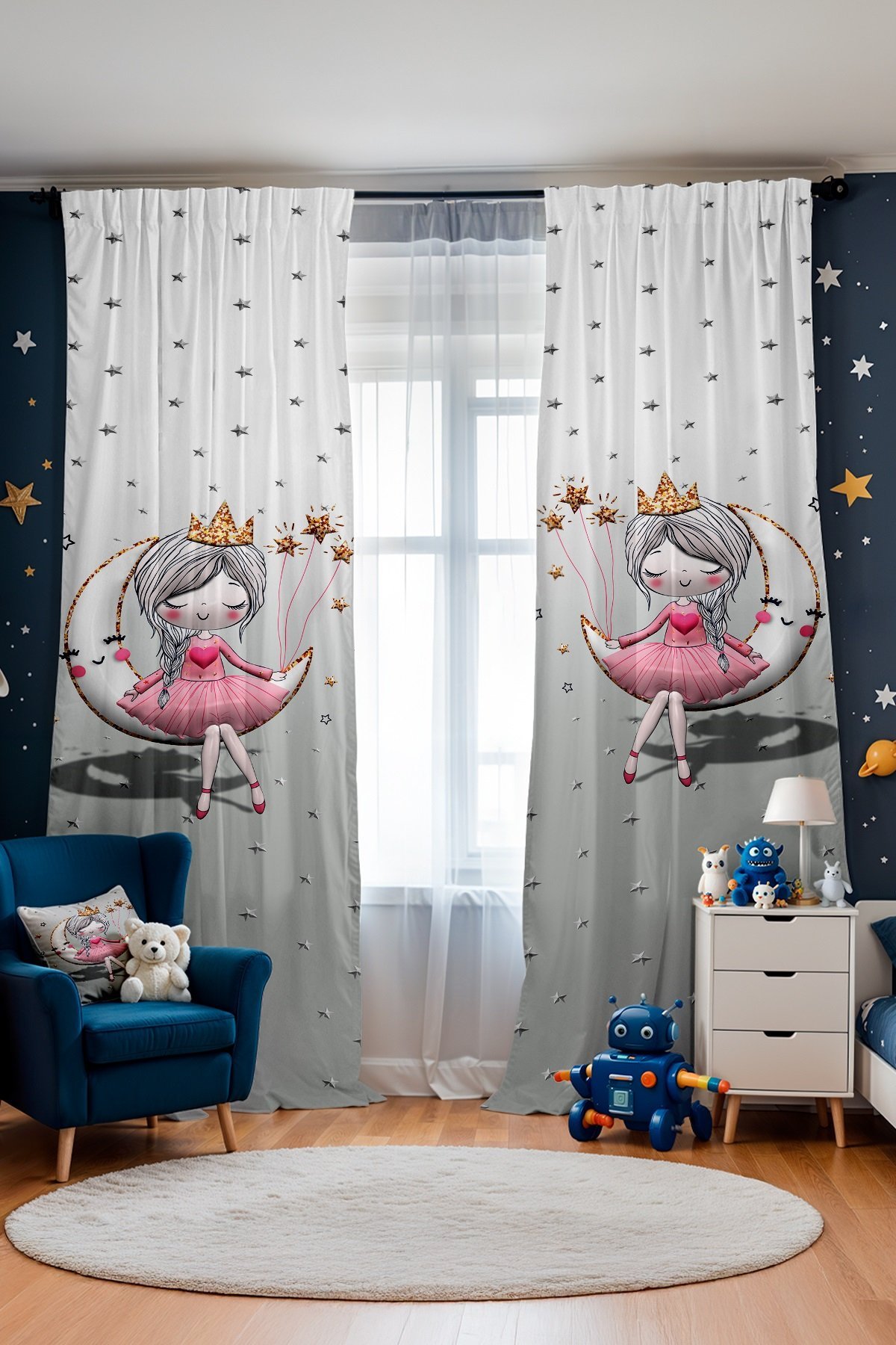 3B Gri Aydaki Prenses Desenli Çocuk Bebek Odası Fon Perde (Tek Kanat Fiyatlandırma)