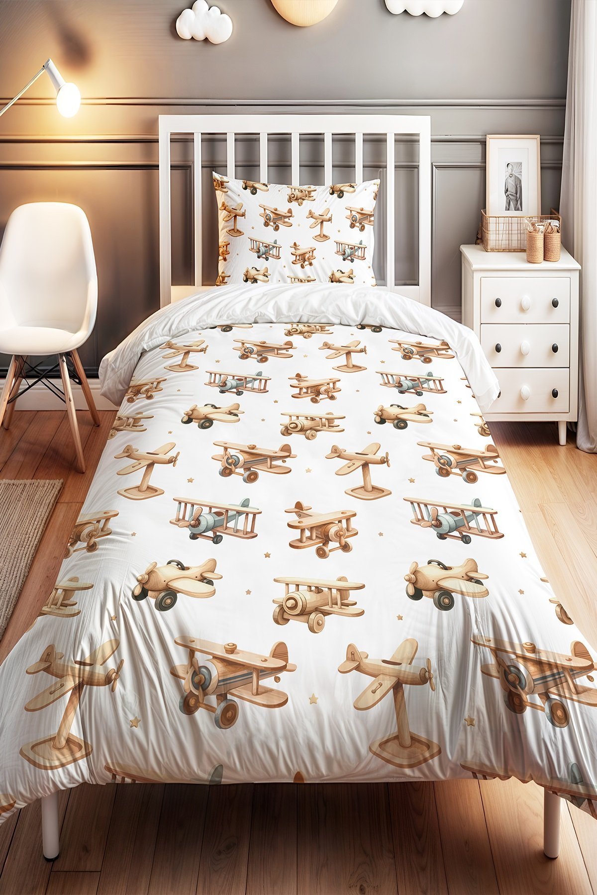Ahşap Uçaklar Desenli Tek Kişilik Bebek Çocuk Nevresim Seti