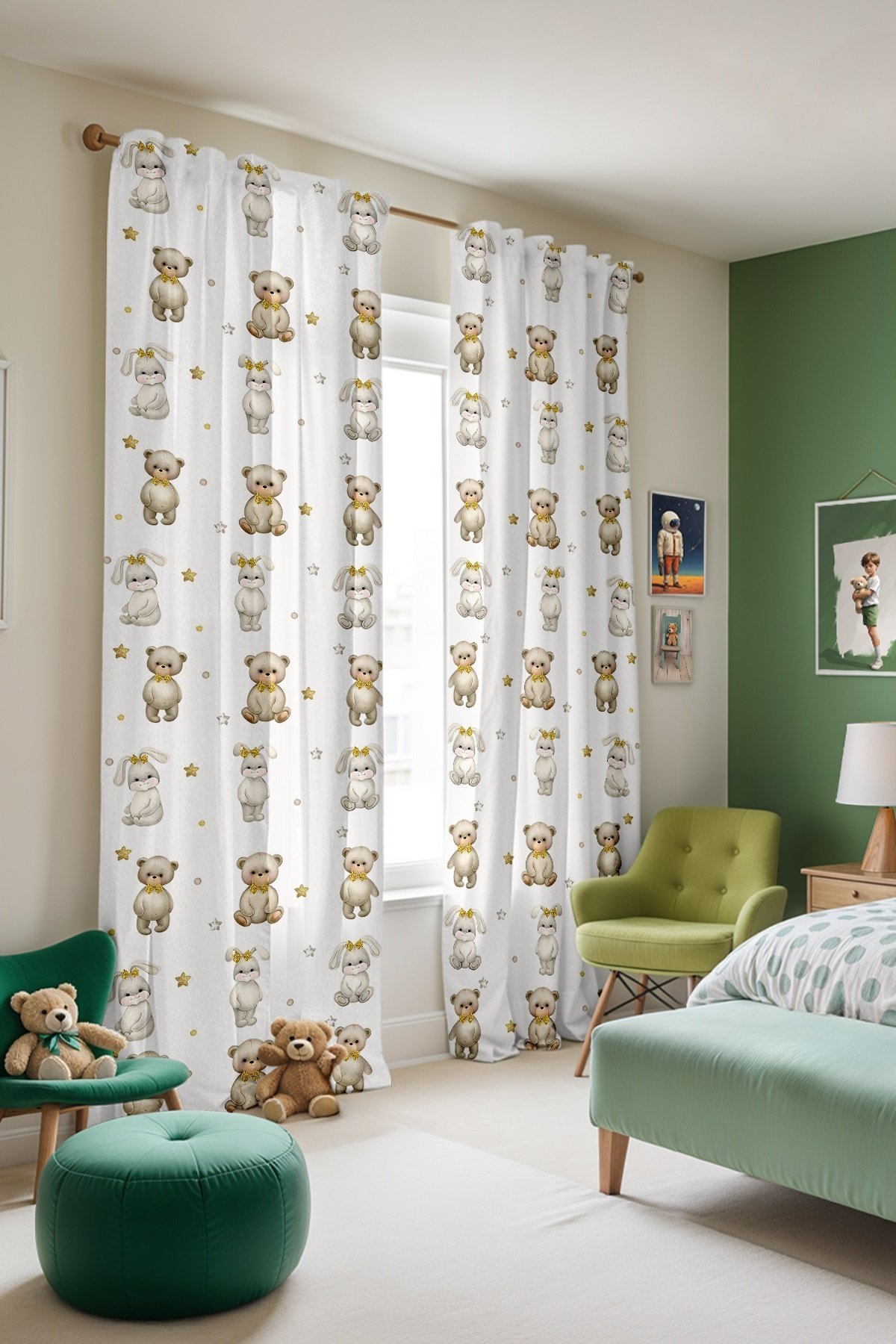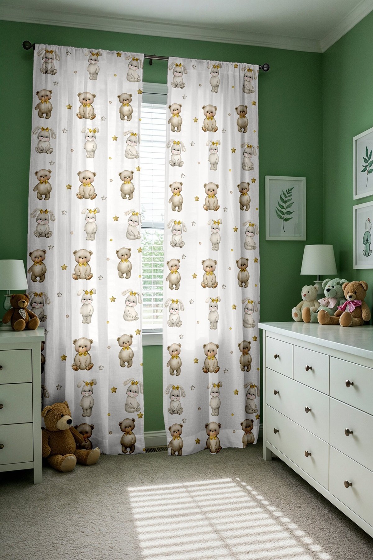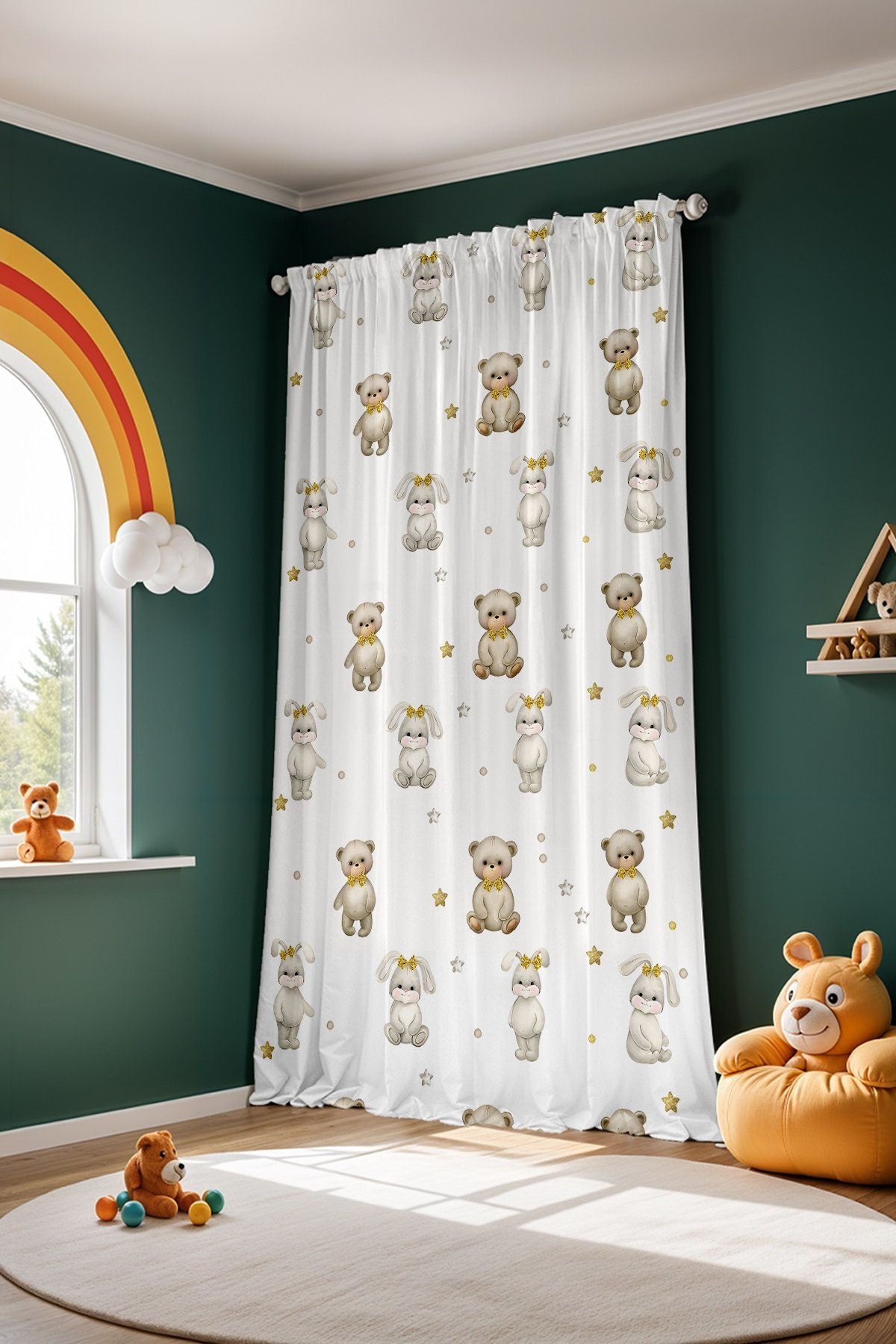 Altın Fiyonklu Ayı ve Tavşan Desenli Çocuk Bebek Odası Fon Perde (Tek Kanat Fiyatlandırma)