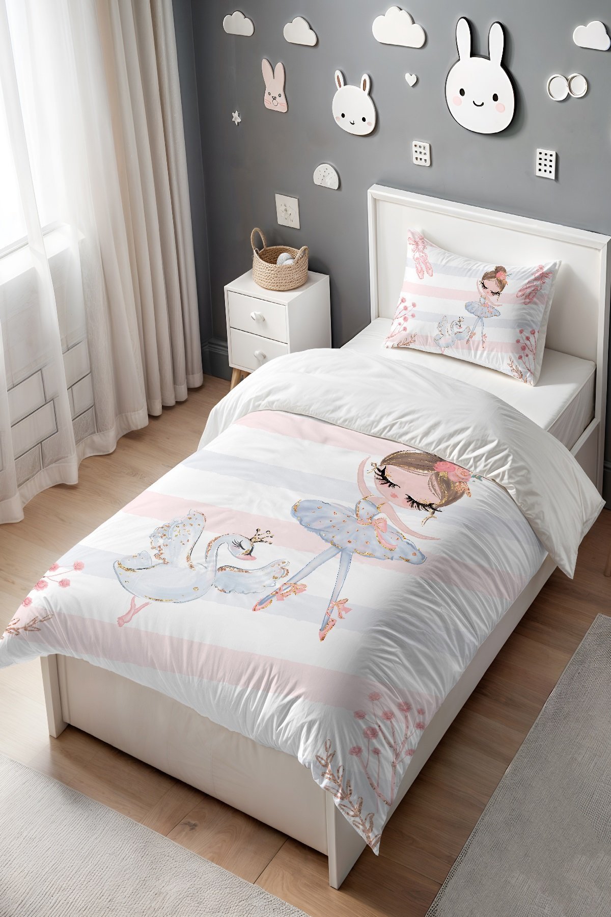 Altın Kuğu ve Balerin Desenli Tek Kişilik Bebek Çocuk Nevresim Seti