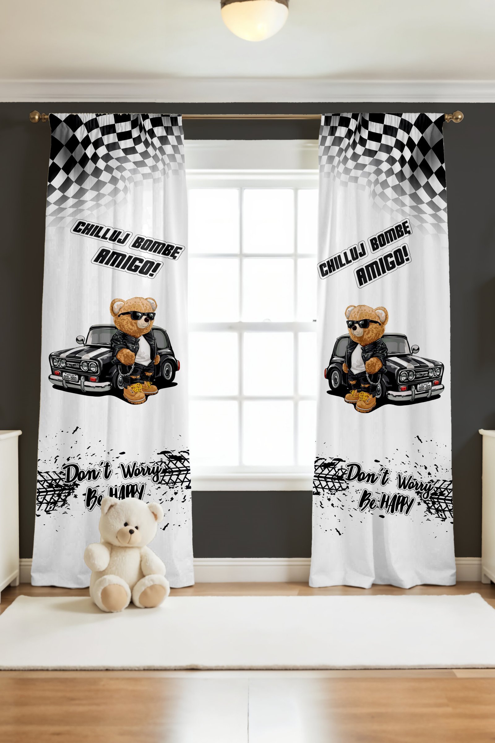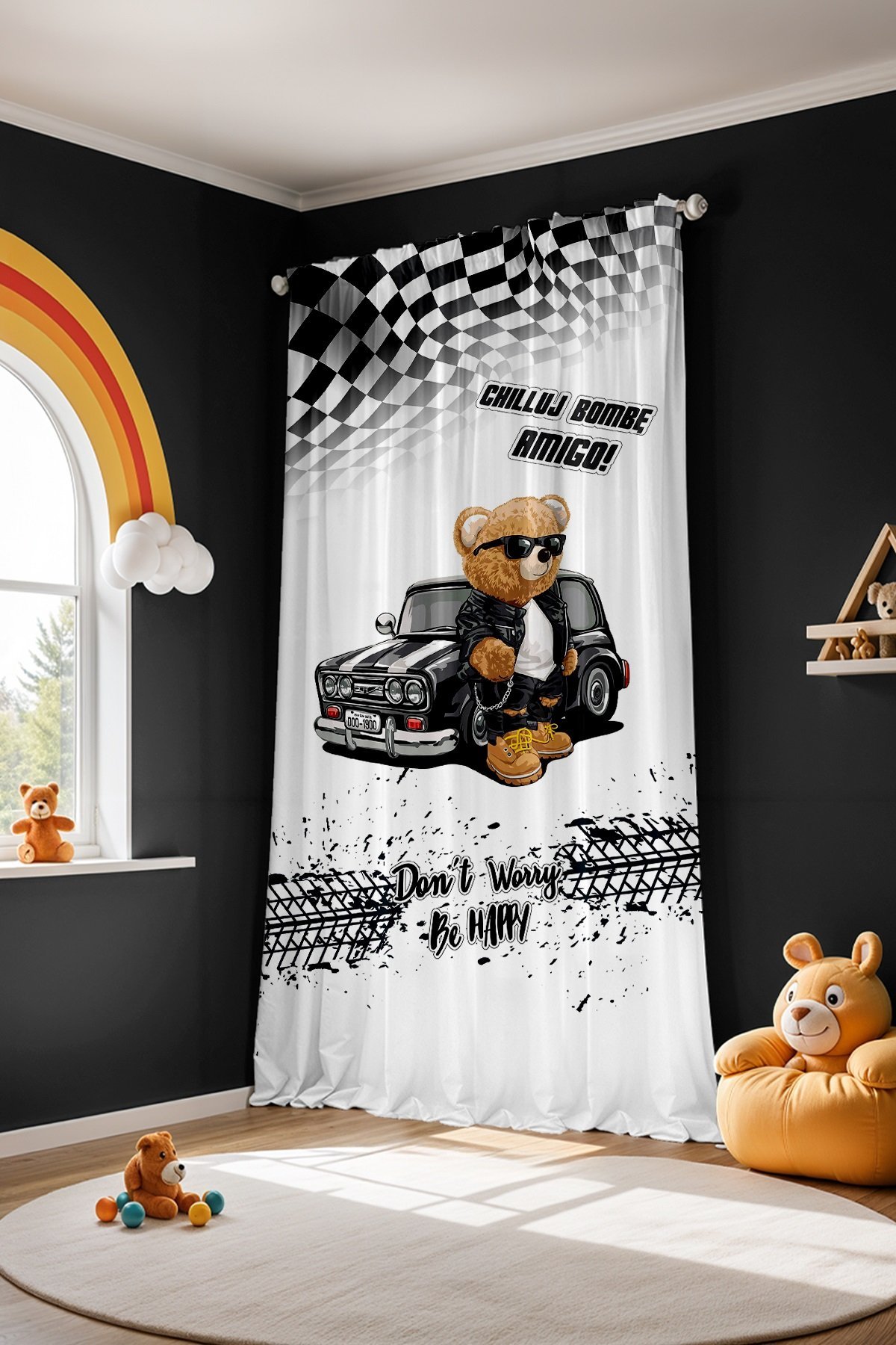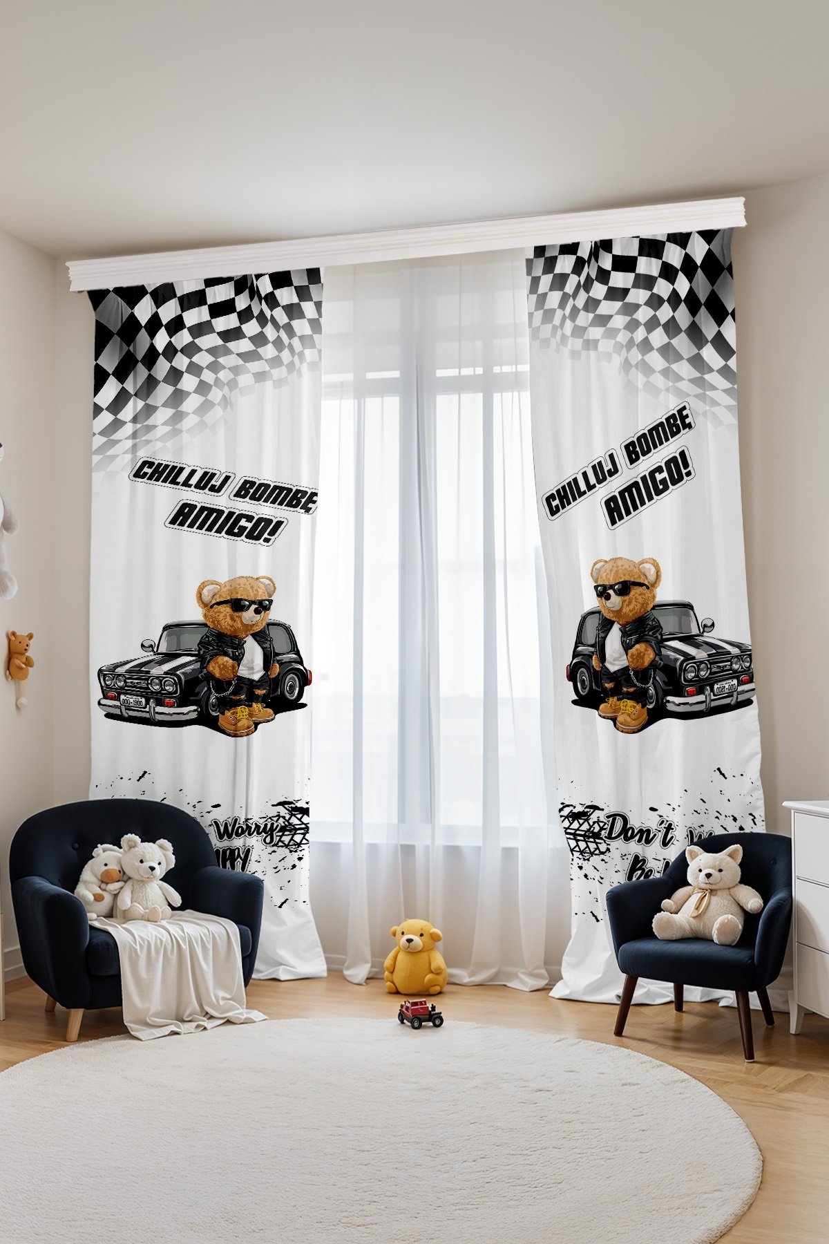 Arabalı Ayı Teddy Desenli Çocuk Bebek Odası Fon Perde (Tek Kanat Fiyatlandırma)