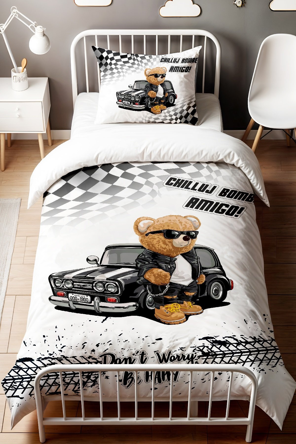 Arabalı Ayı Teddy Desenli Tek Kişilik Bebek Çocuk Nevresim Seti