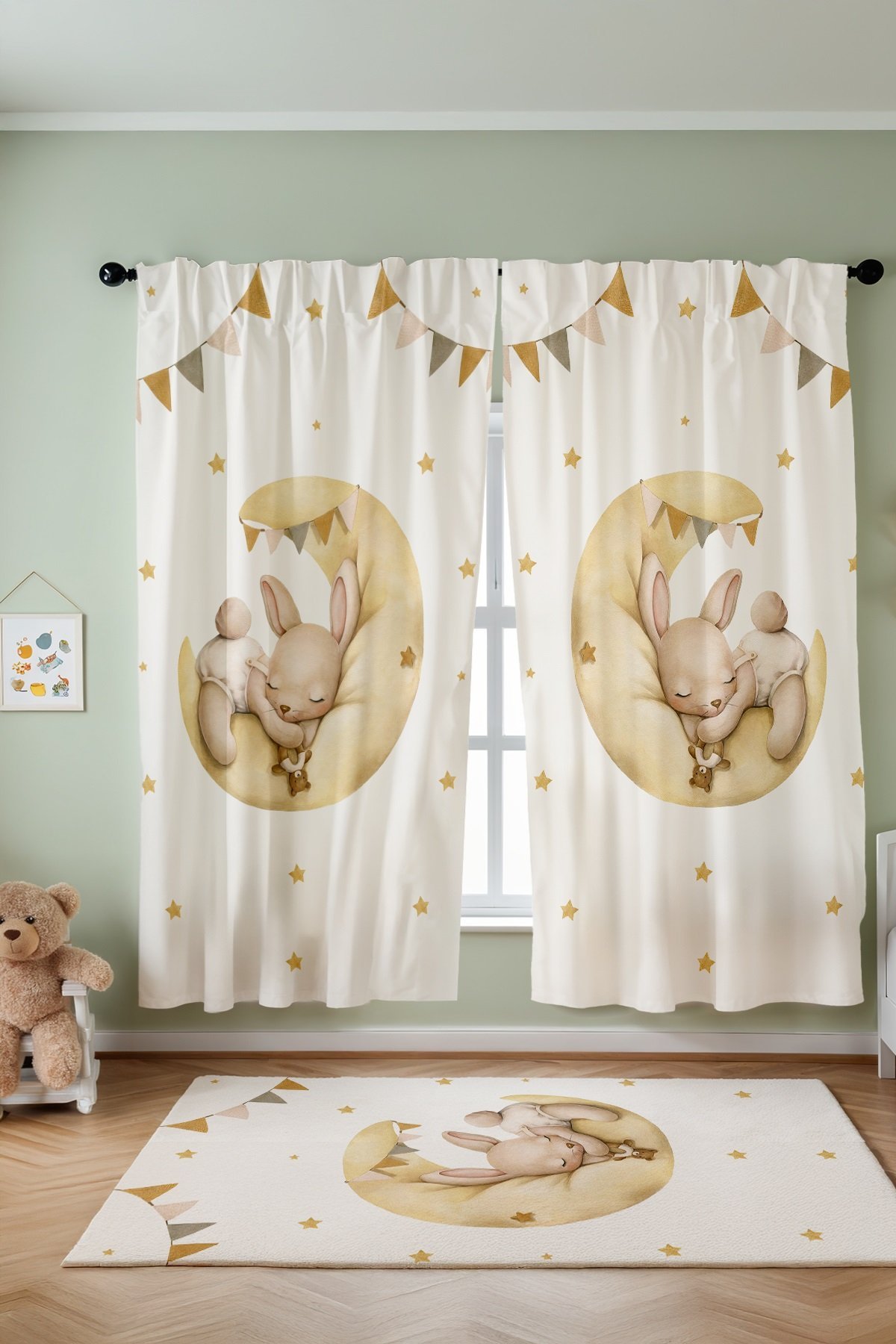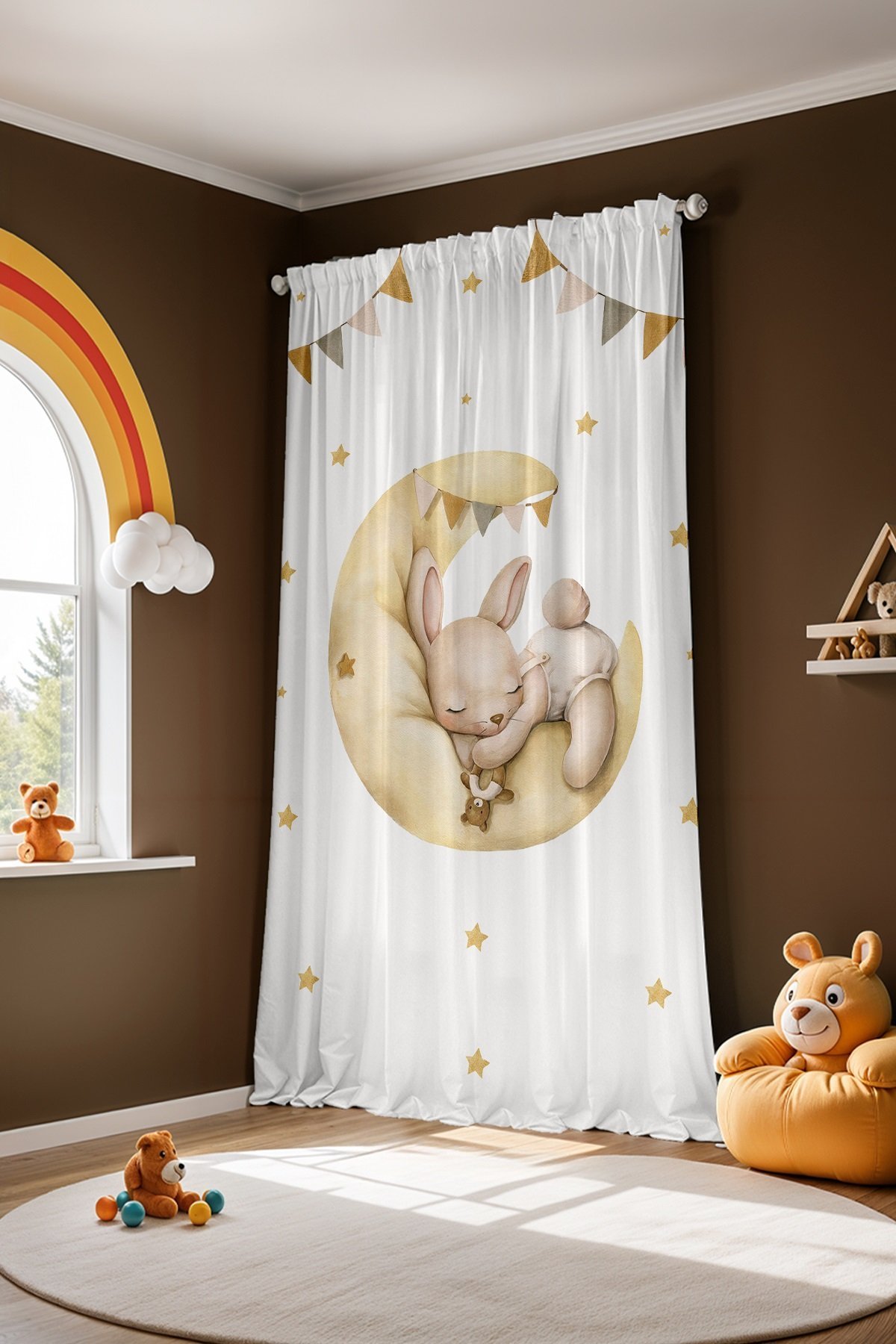 Ayda Uyuyan Tavşan Desenli Çocuk Bebek Odası Fon Perde (Tek Kanat Fiyatlandırma)