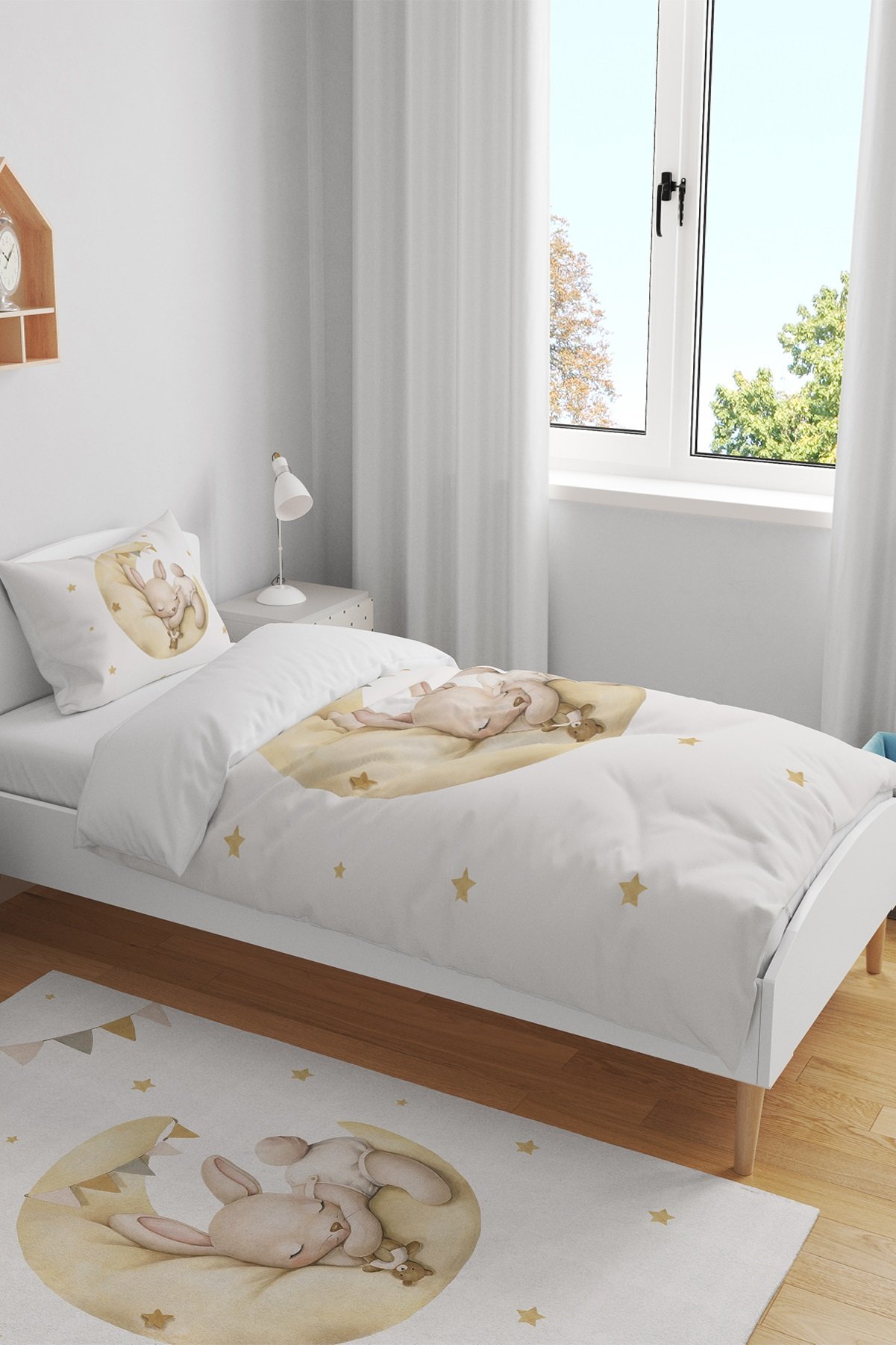 Ayda Uyuyan Tavşan Desenli Tek Kişilik Bebek Çocuk Nevresim Takımı