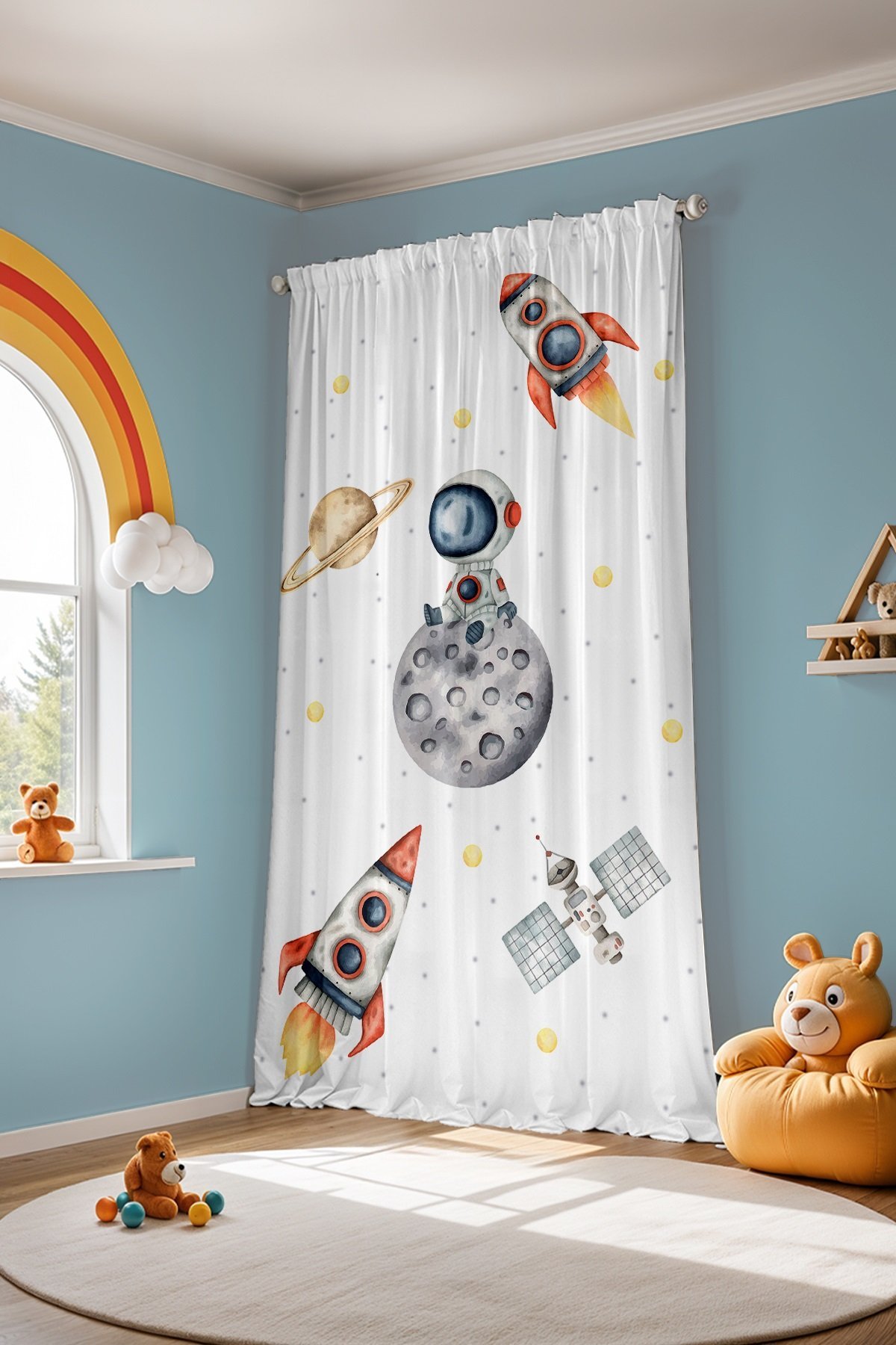 Aydaki Astronot Desenli Çocuk Bebek Odası Fon Perde (Tek Kanat Fiyatlandırma)