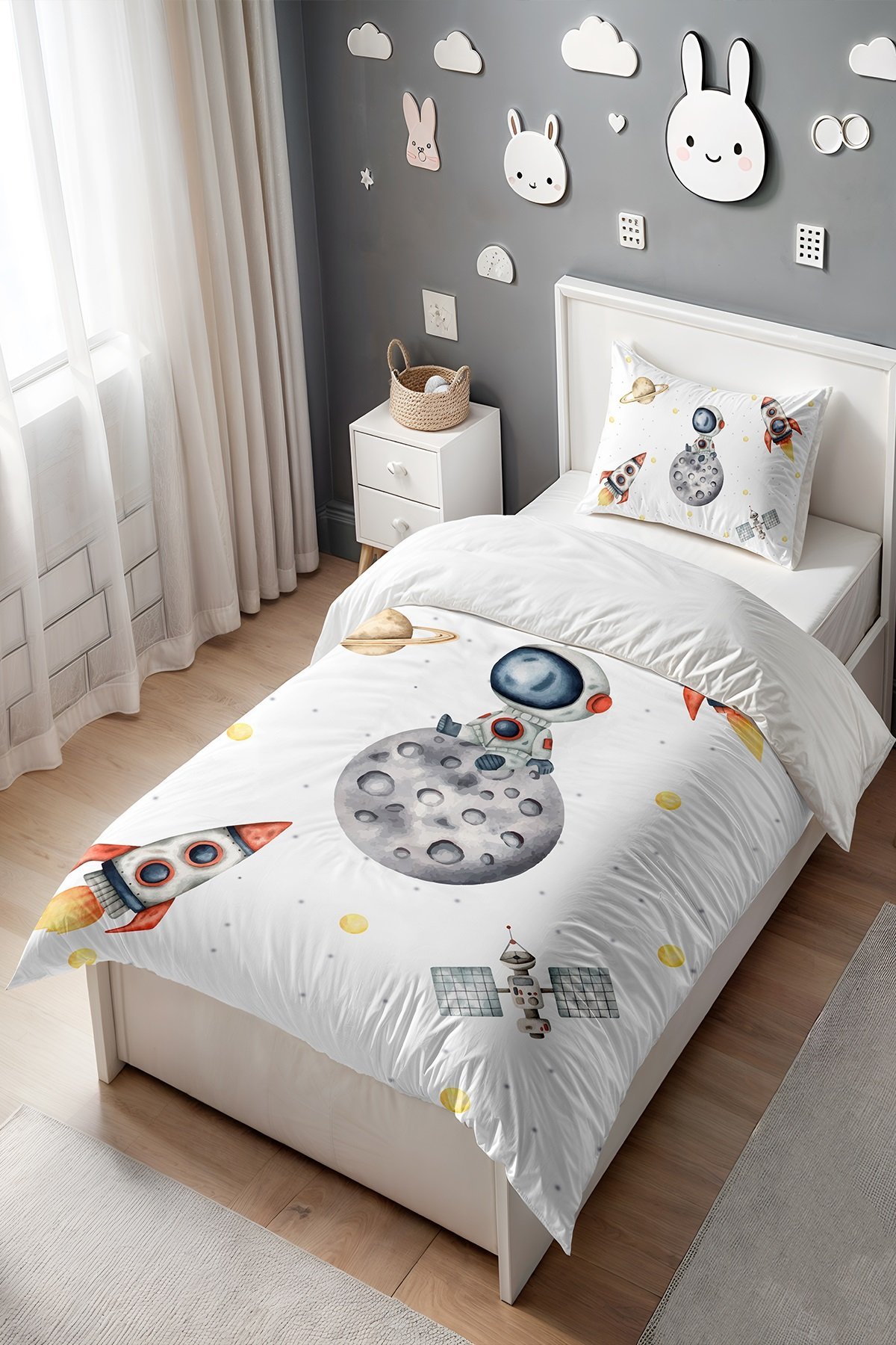 Aydaki Astronot Desenli Tek Kişilik Bebek Çocuk Nevresim Seti