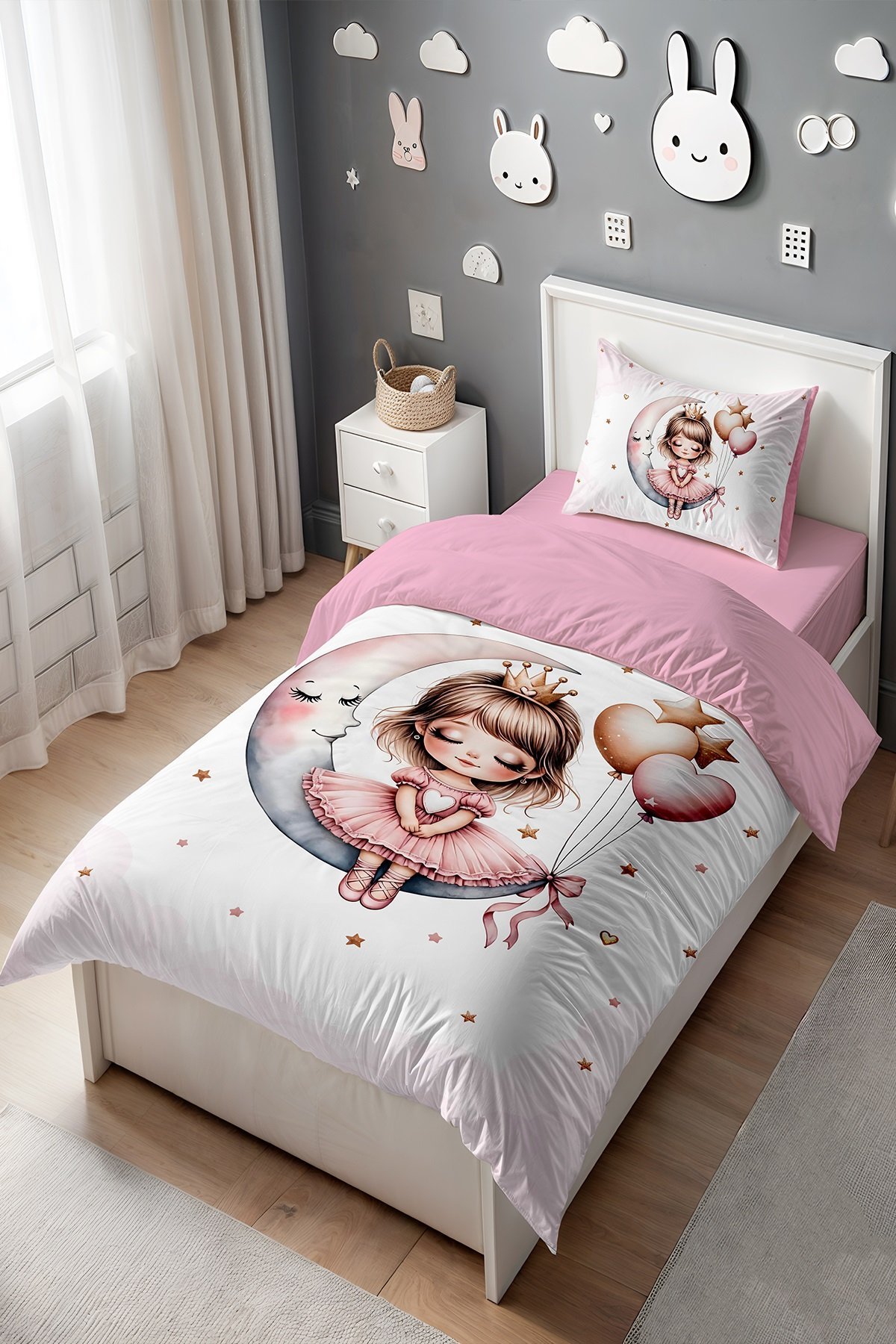Aydaki Sevimli Prenses Desenli Tek Kişilik Bebek Çocuk Nevresim Seti