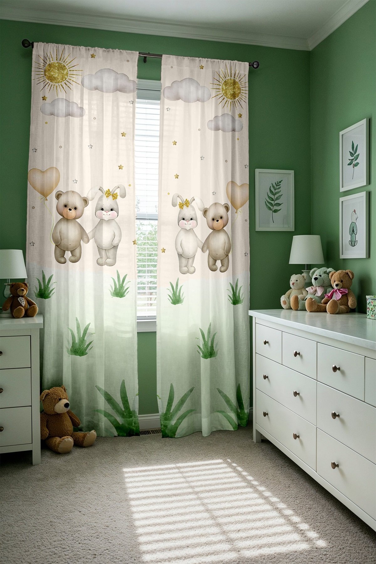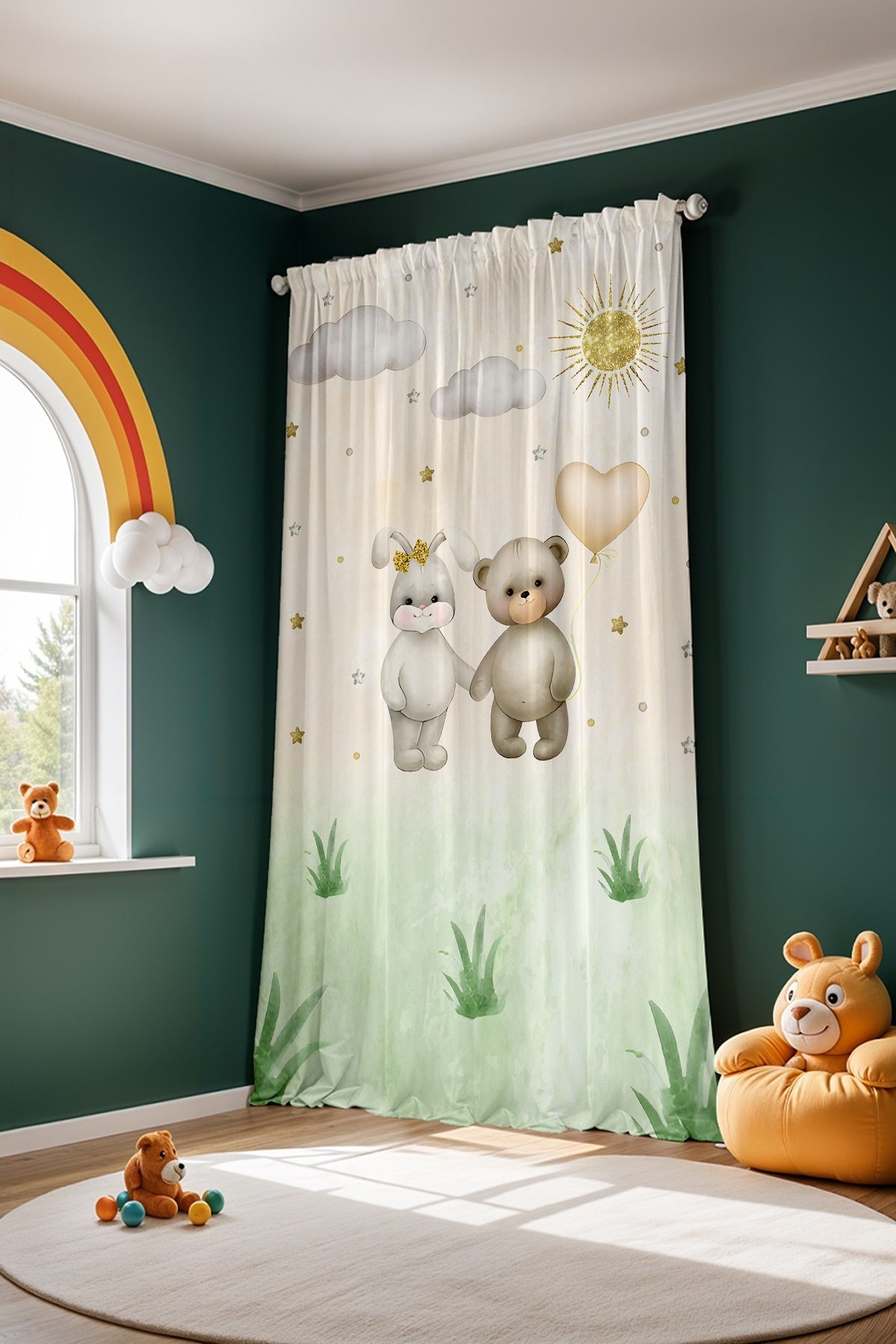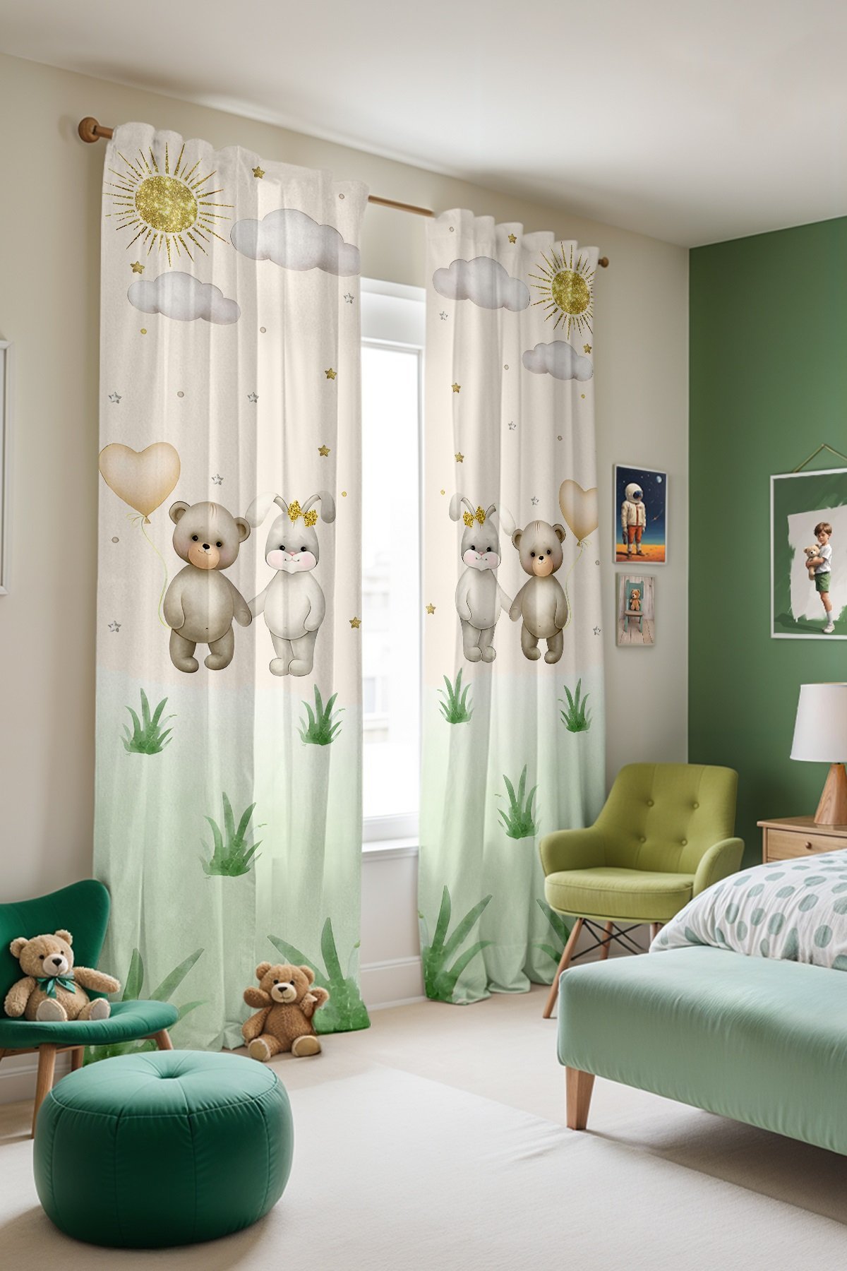 Ayı ve Tavşan Kardeş Desenli Çocuk Bebek Odası Fon Perde (Tek Kanat Fiyatlandırma)