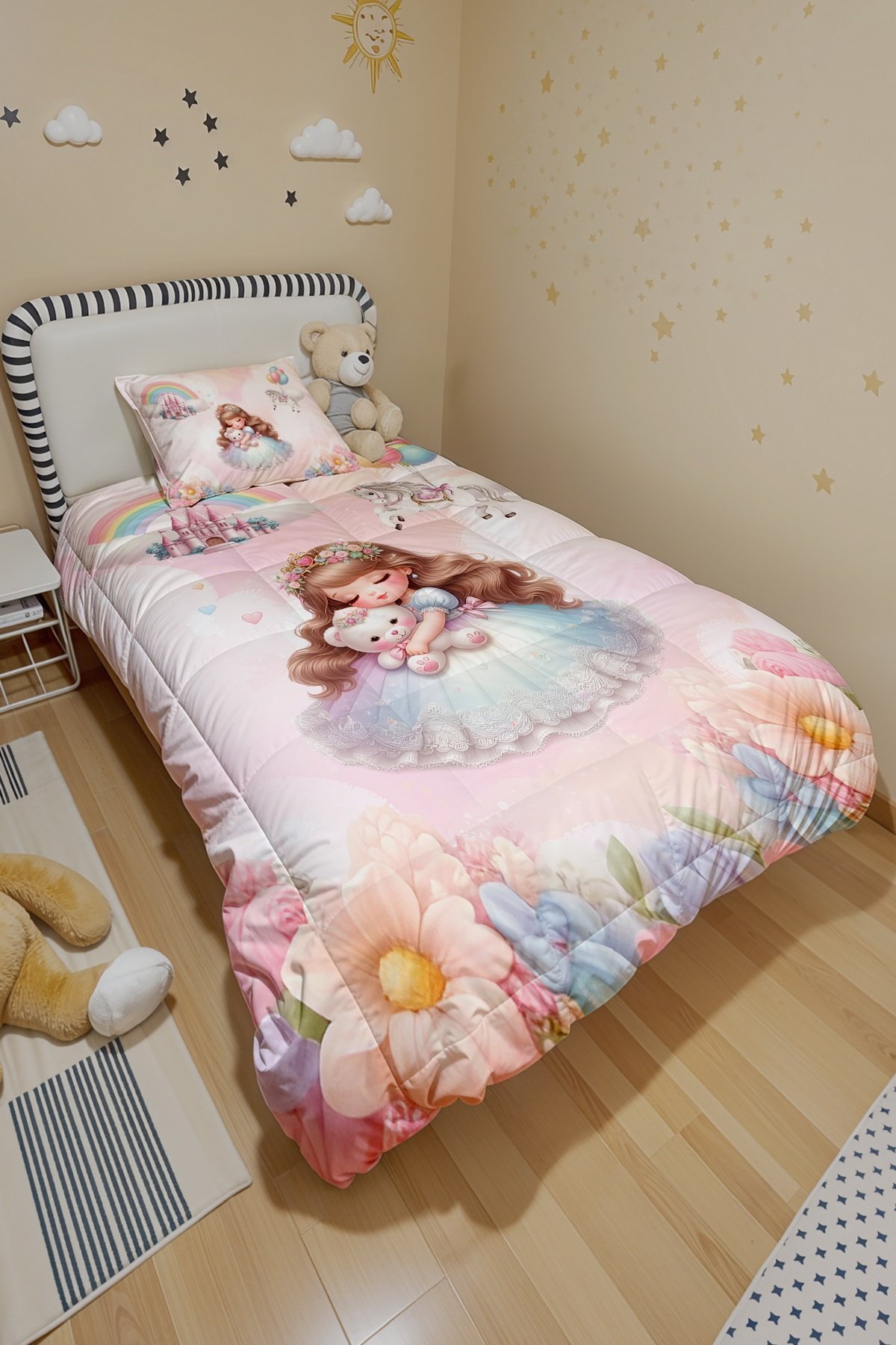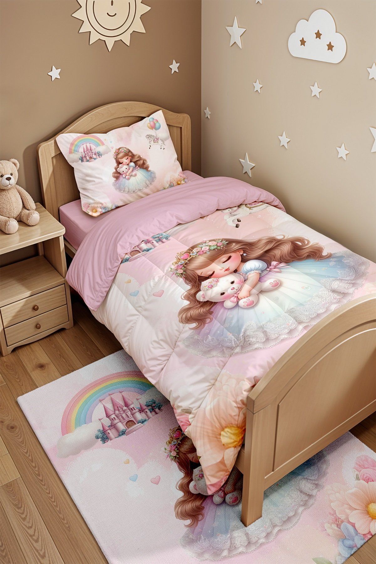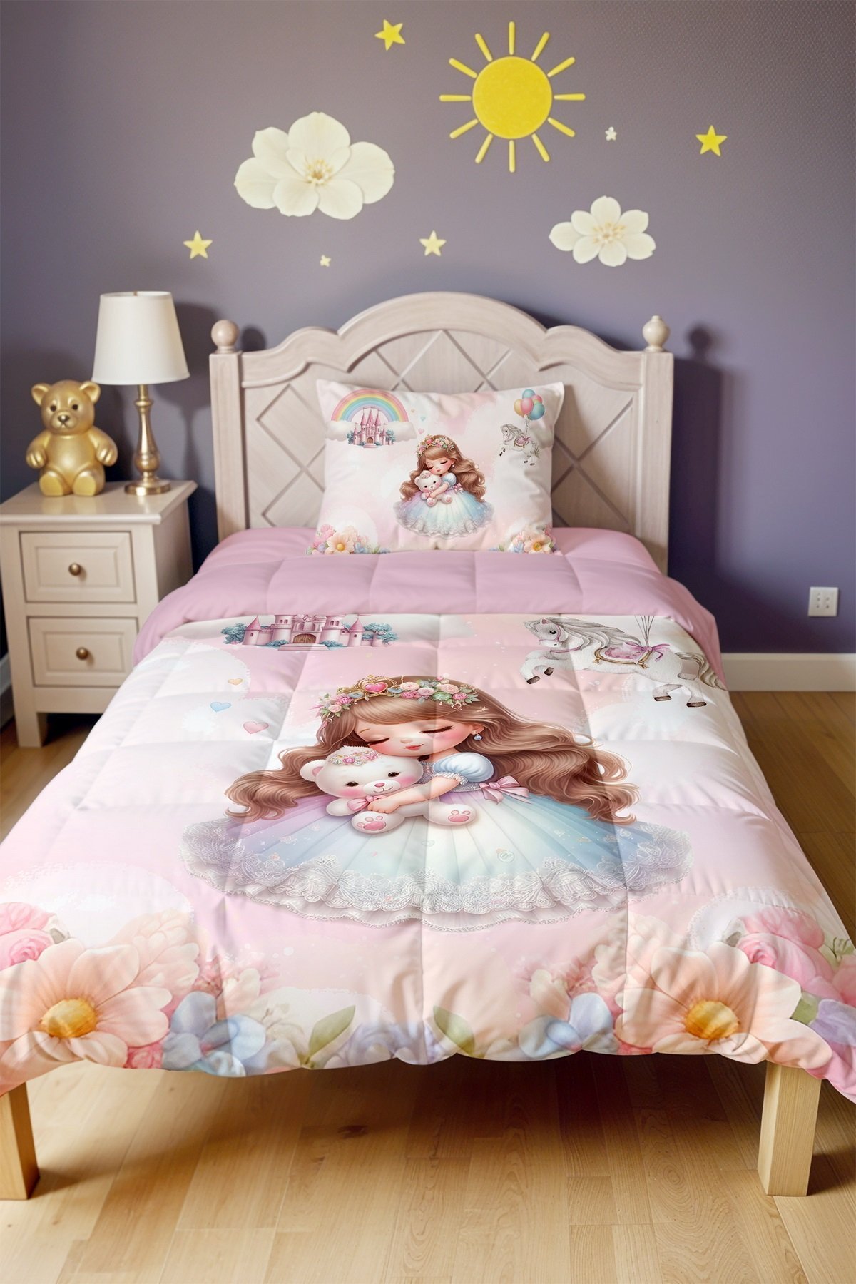 Ayıcıklı Prenses Desenli Tek Kişilik Yorgan ve Yastık Kılıfı