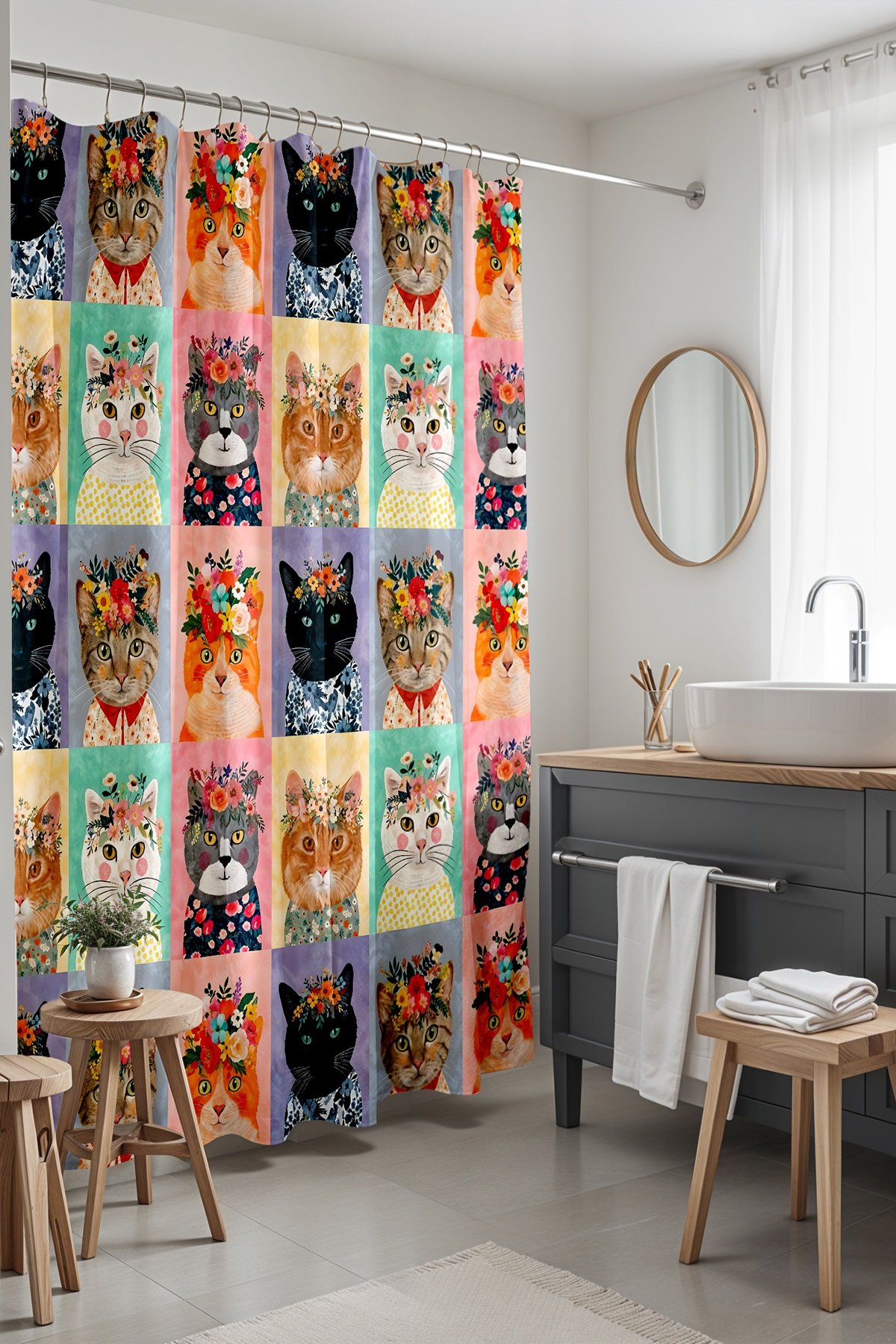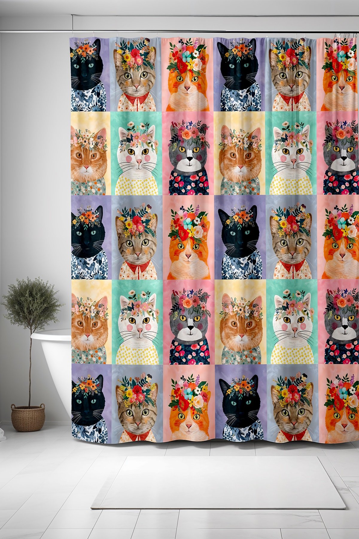 Banyo Perdesi, Çiçek Taçlı Kediler Desenli Duş Perdesi, Küvet Perdesi 175x200cm