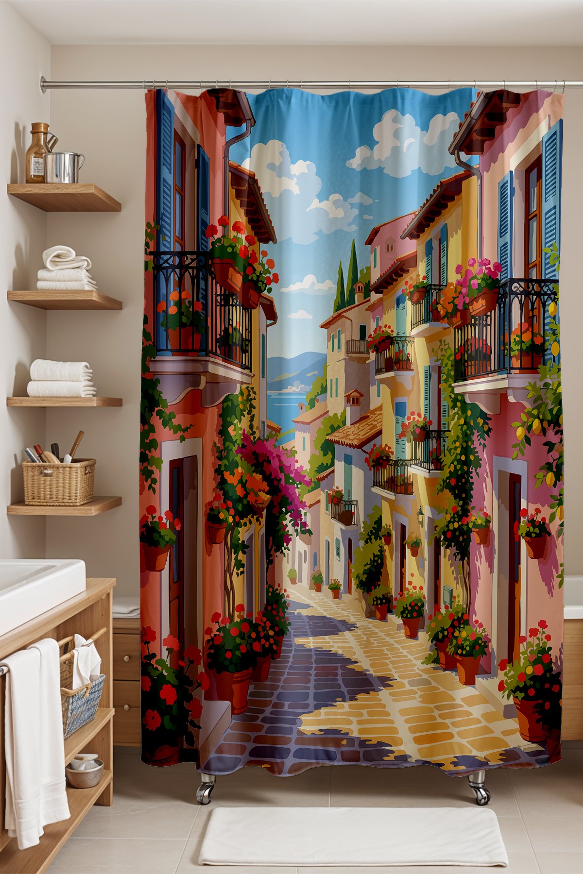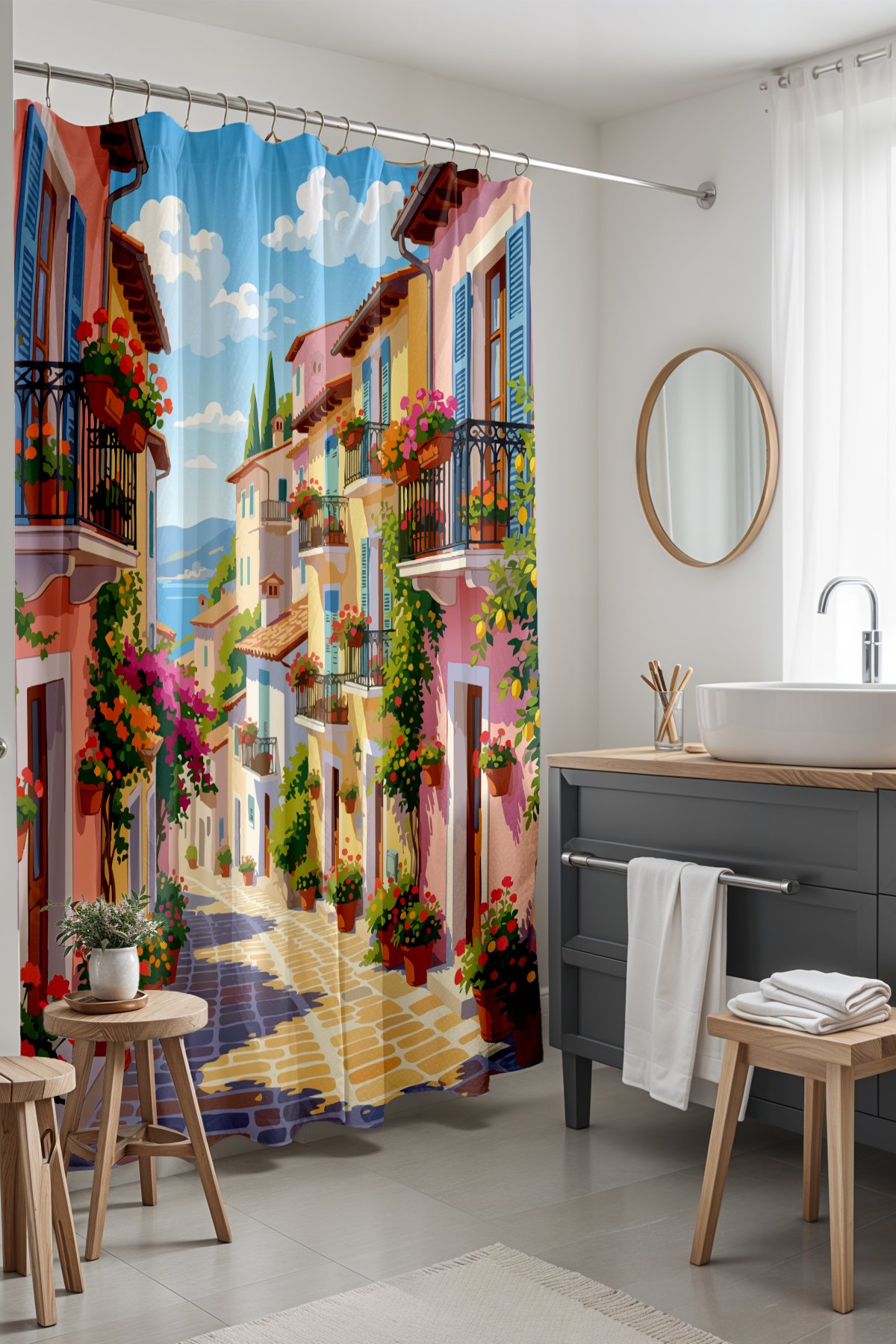 Banyo Perdesi, Çiçekli Teraslar Desenli Duş Perdesi, Küvet Perdesi 175x200cm