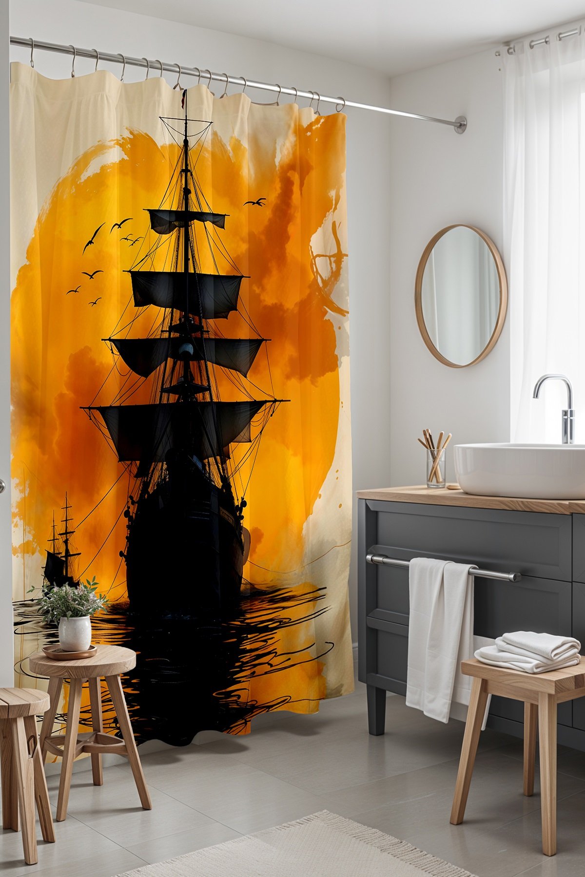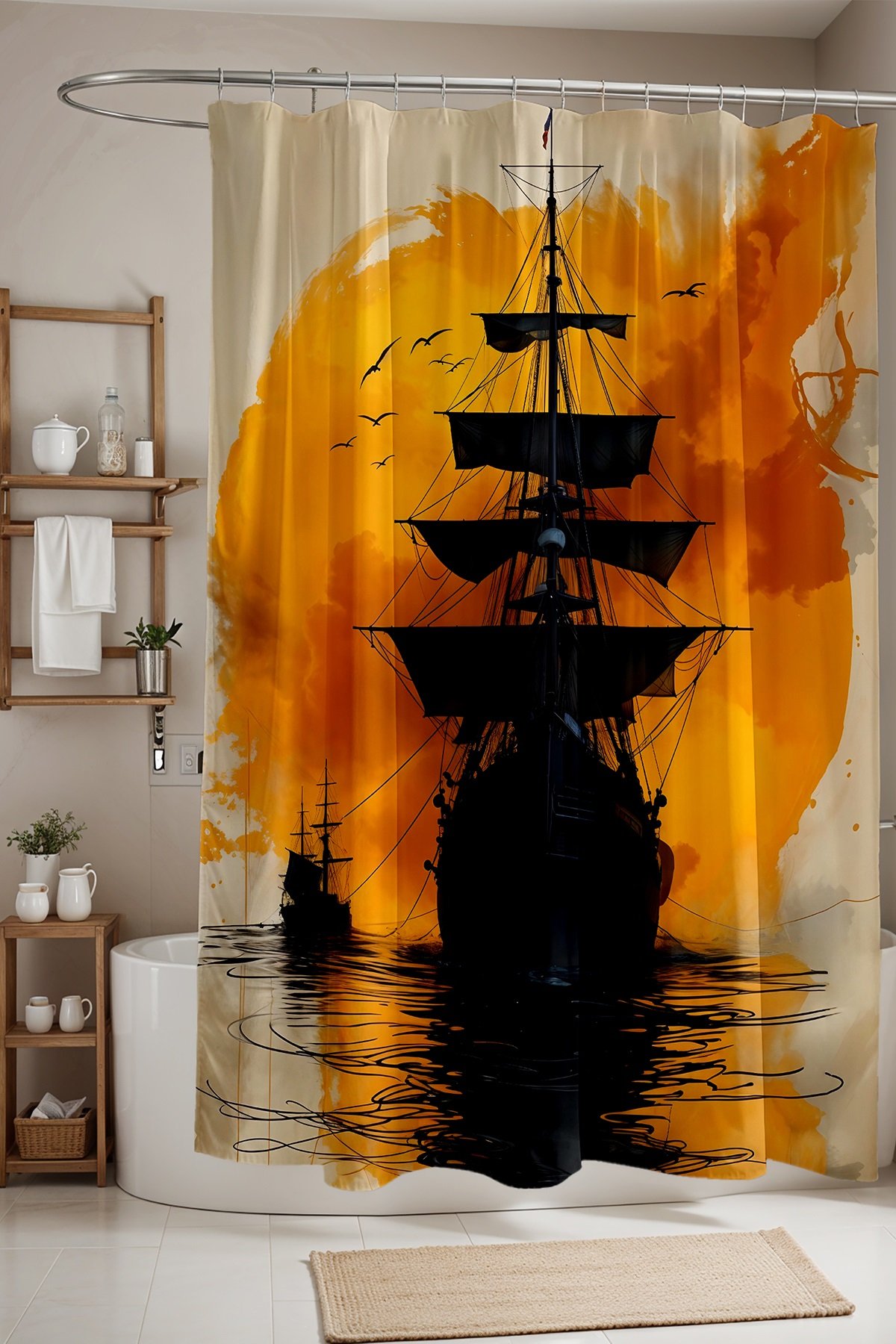 Banyo Perdesi, Güneş Batımındaki Gemi Desenli Duş Perdesi, Küvet Perdesi 175x200cm
