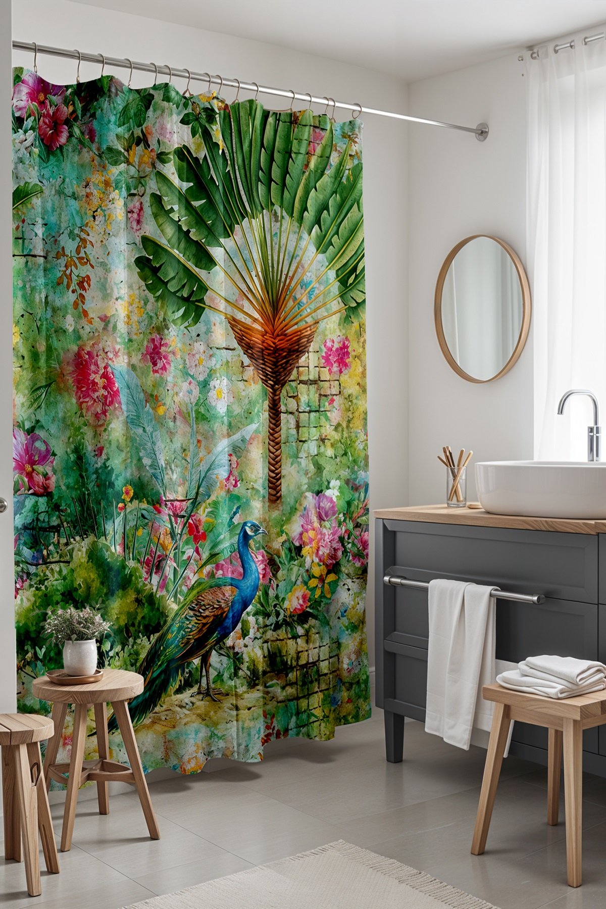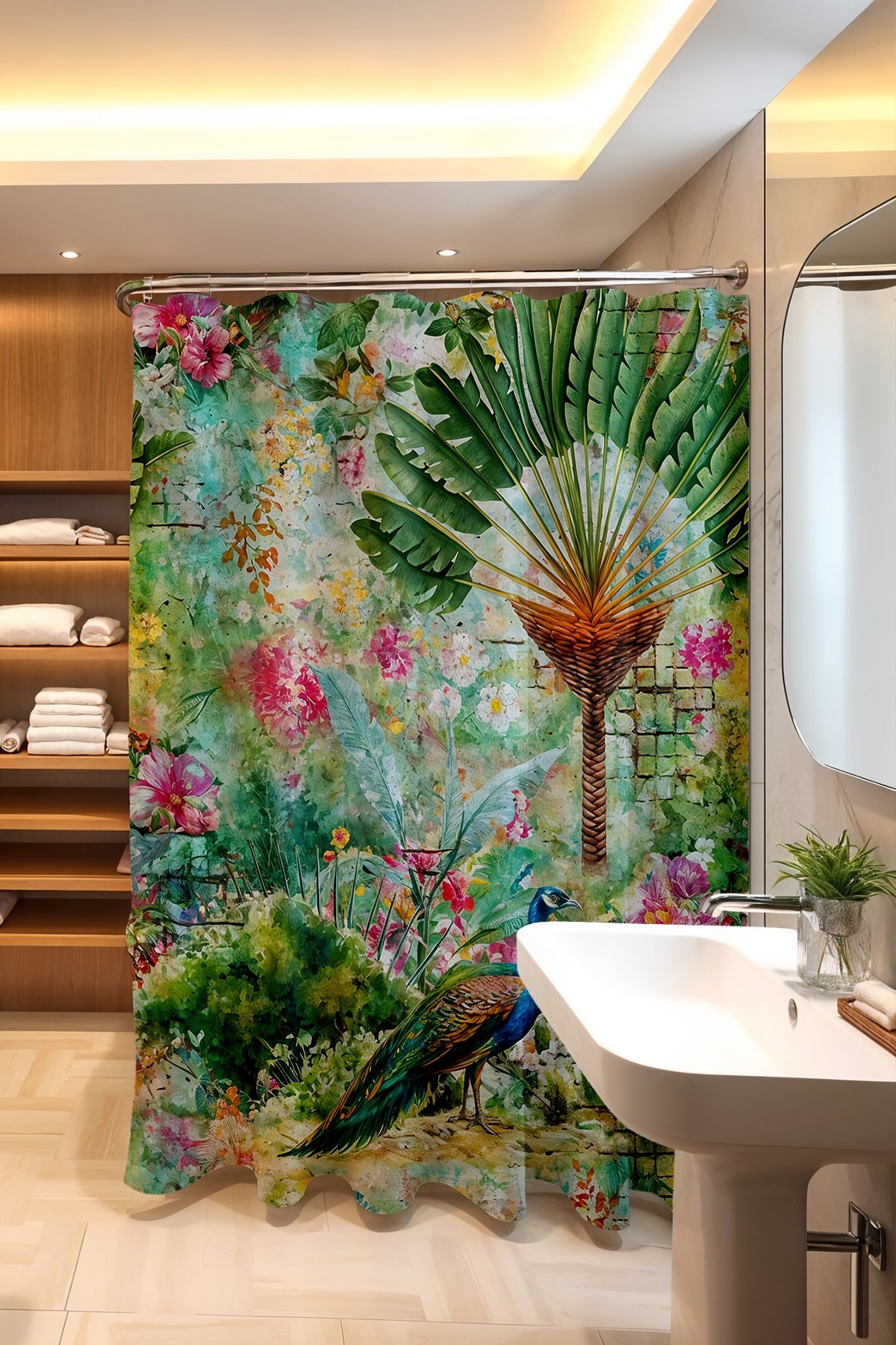 Banyo Perdesi, Hayal Ormanındaki Tavuskuşu Desenli Duş Perdesi, Küvet Perdesi 175x200cm