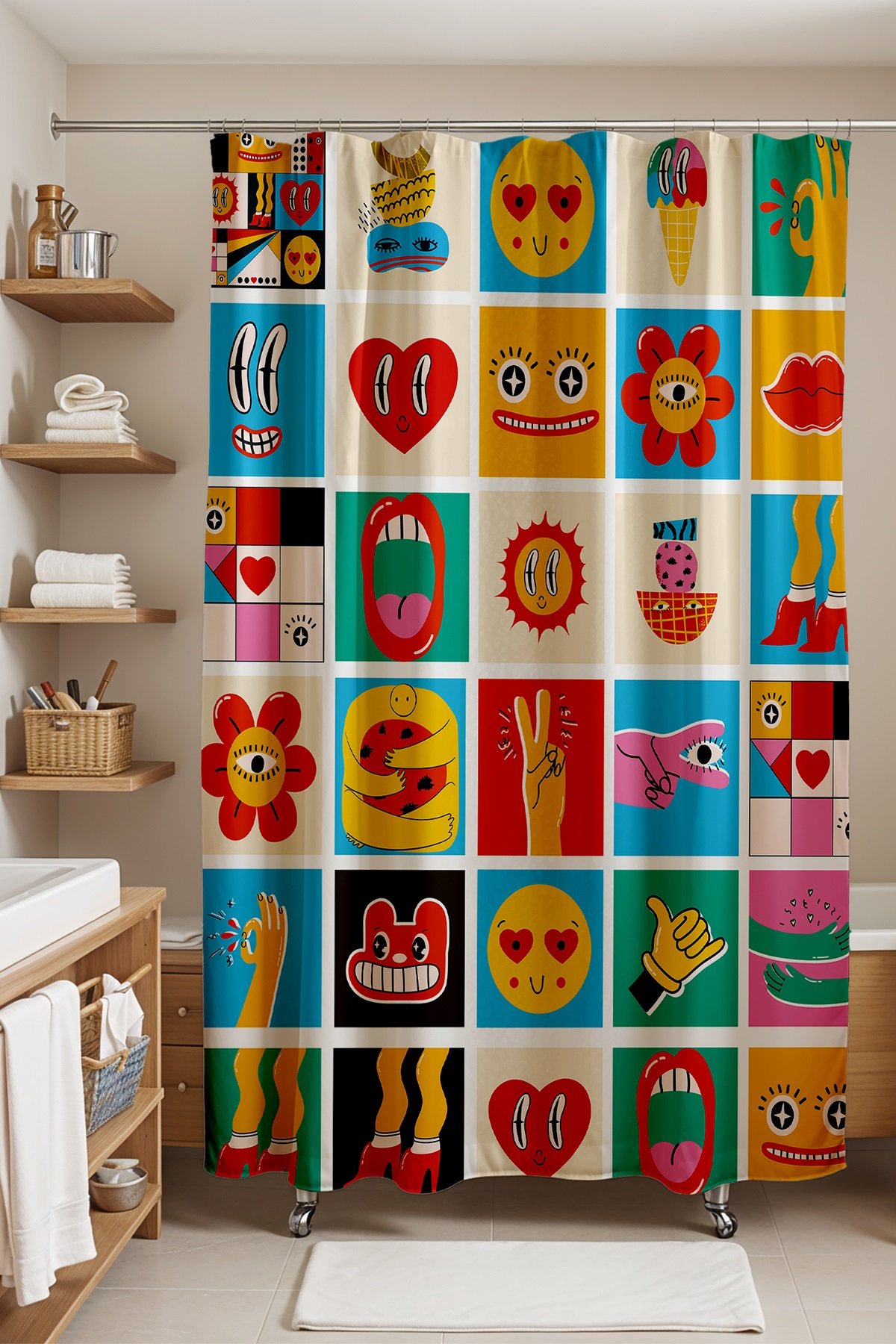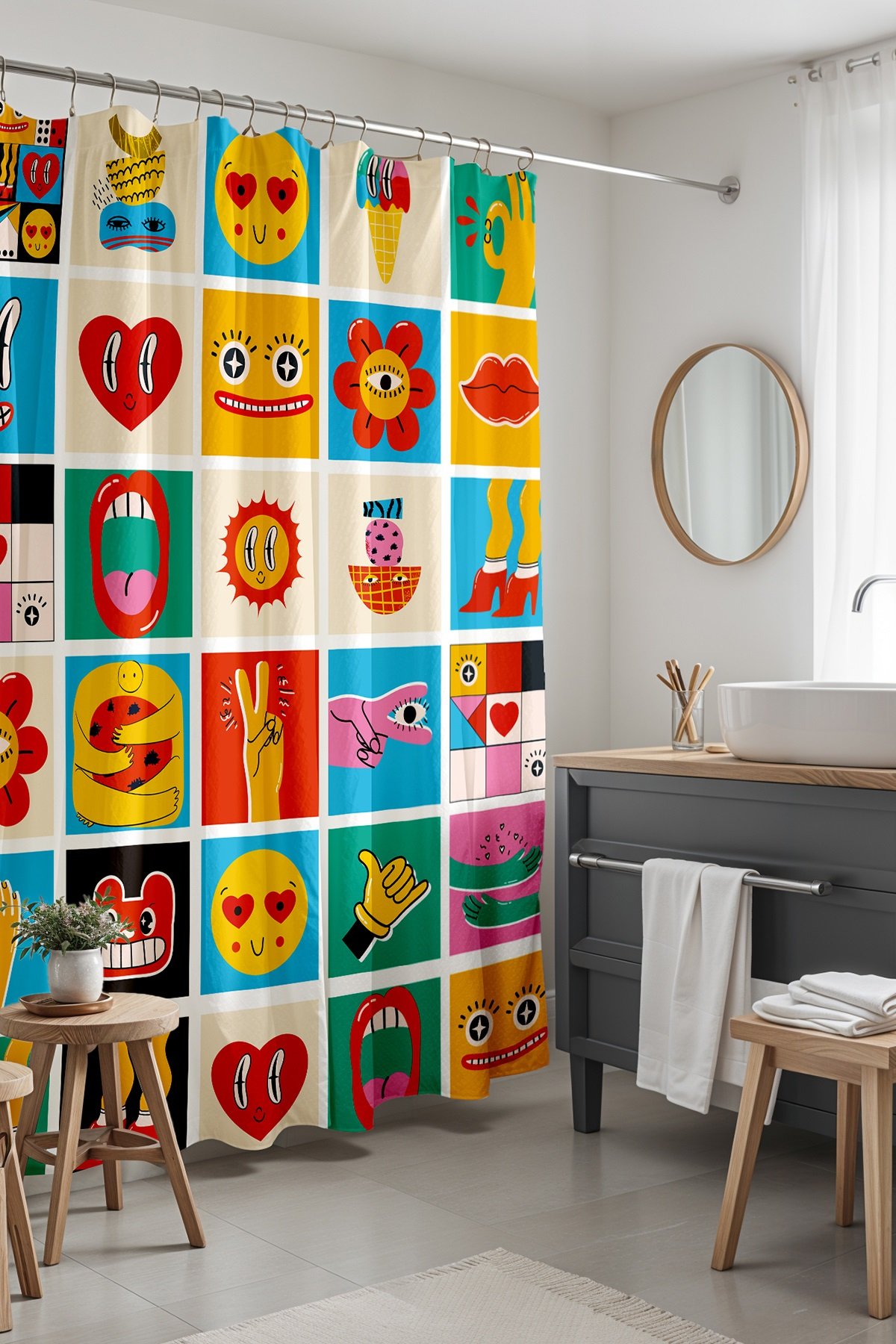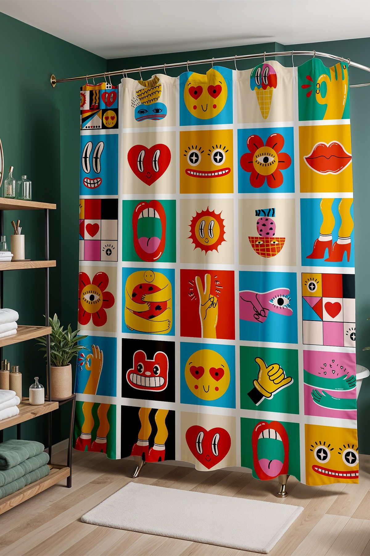Banyo Perdesi, Modern Emojiler Desenli Duş Perdesi, Küvet Perdesi 175x200cm
