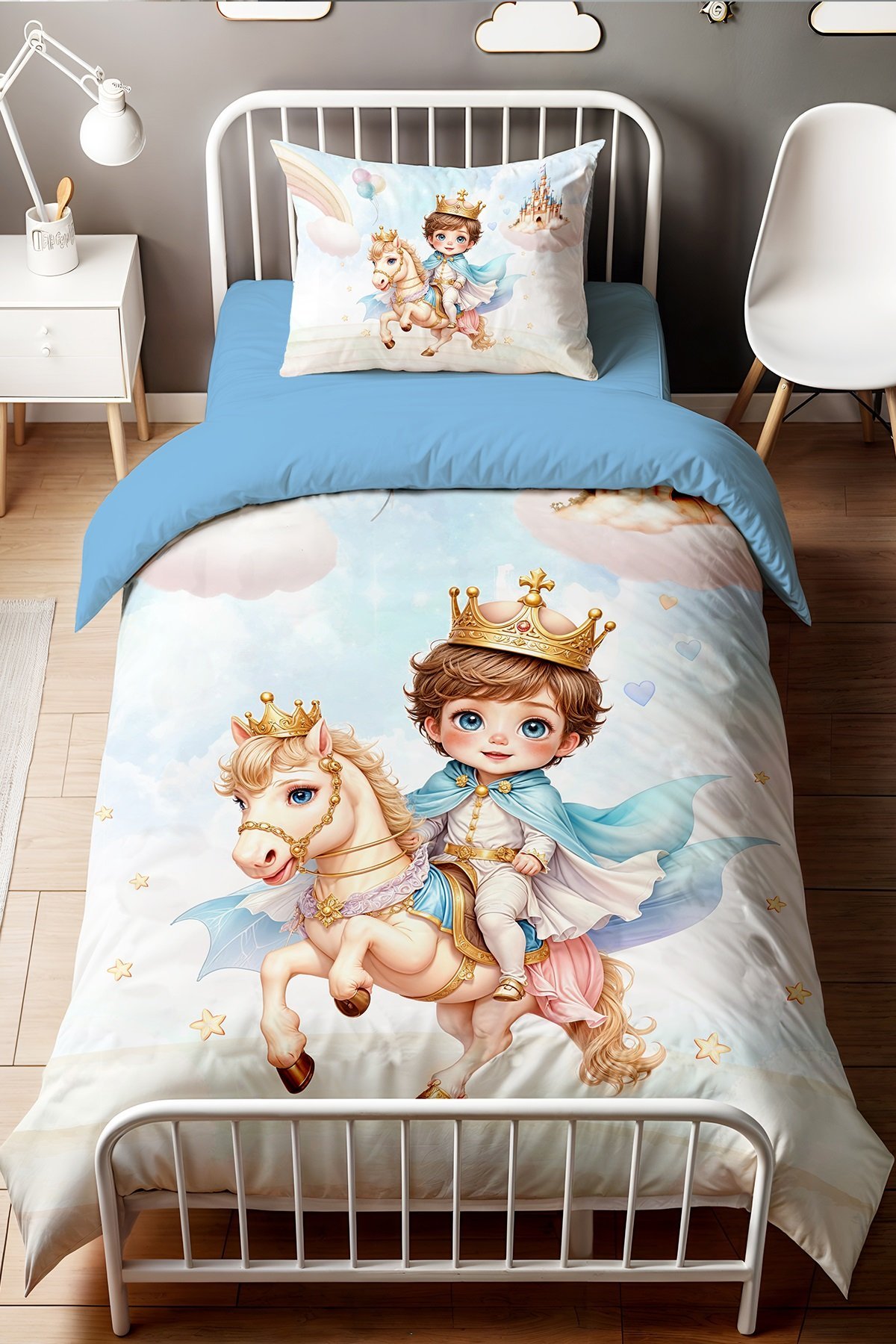 Beyaz Atlı Taçlı Prens Desenli Tek Kişilik Bebek Çocuk Nevresim Seti