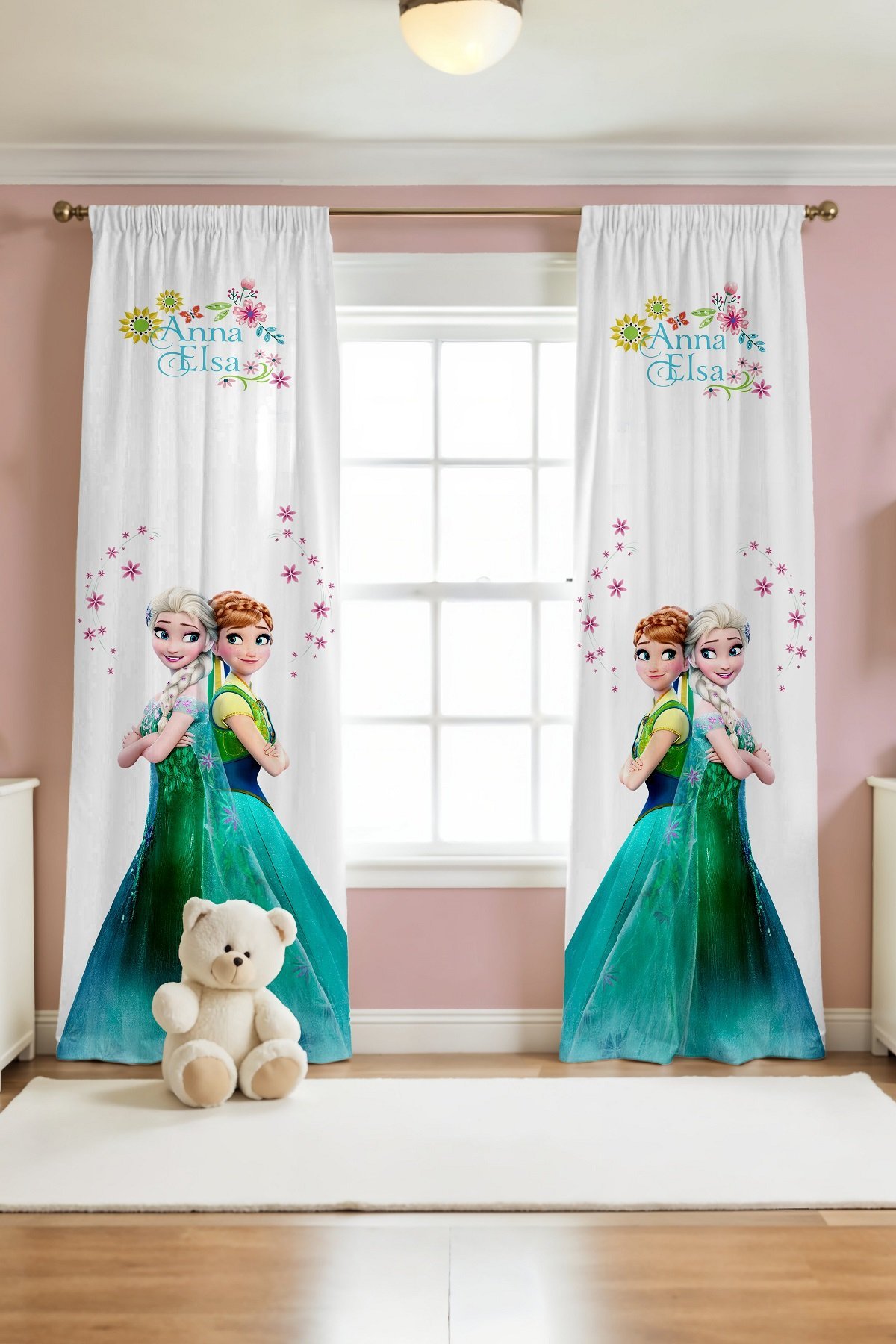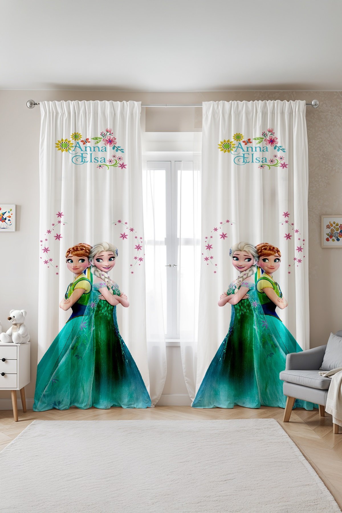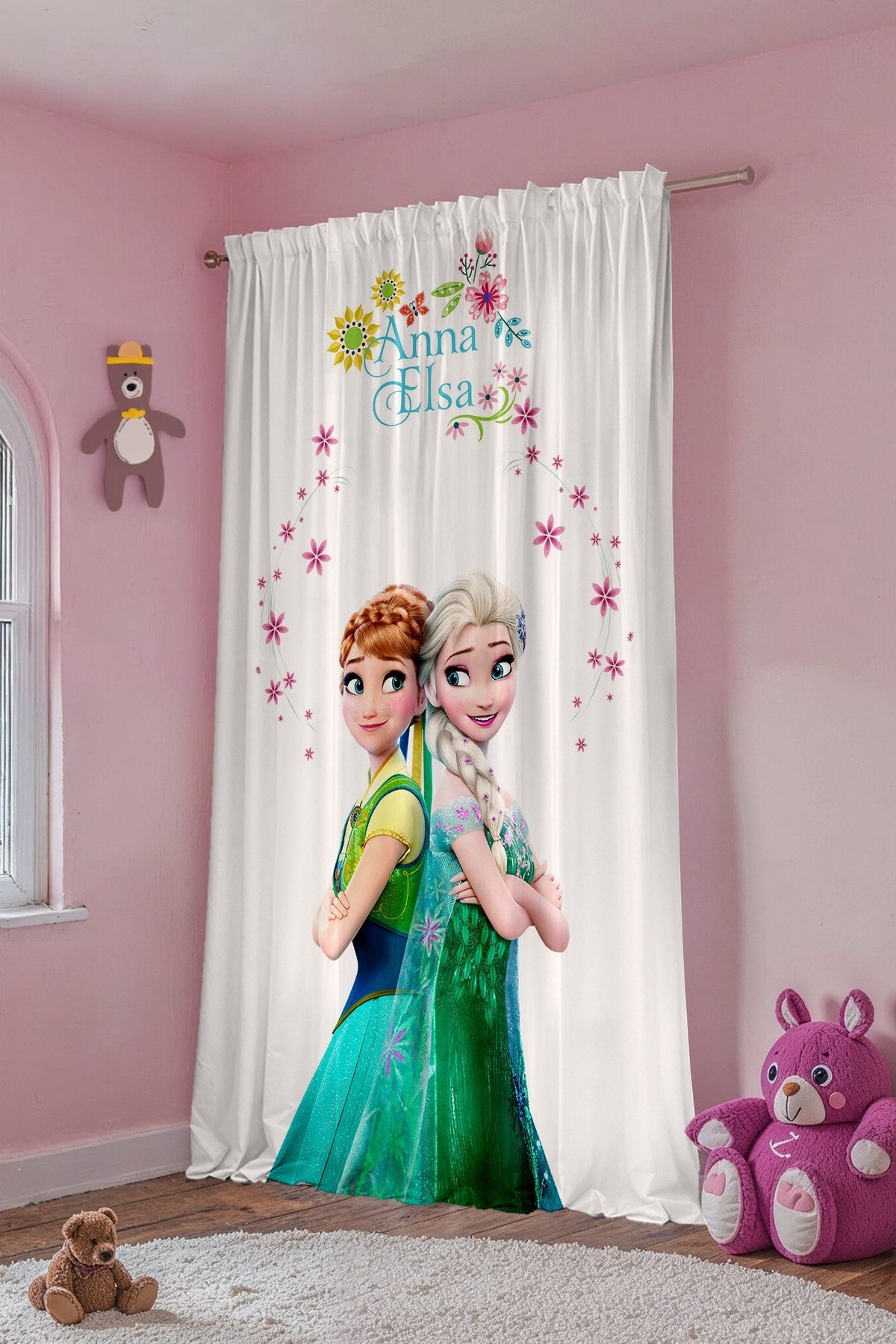 Beyaz Elsa Ve Anna Desenli Çocuk Bebek Odası Fon Perde (Tek Kanat Fiyatlandırma)