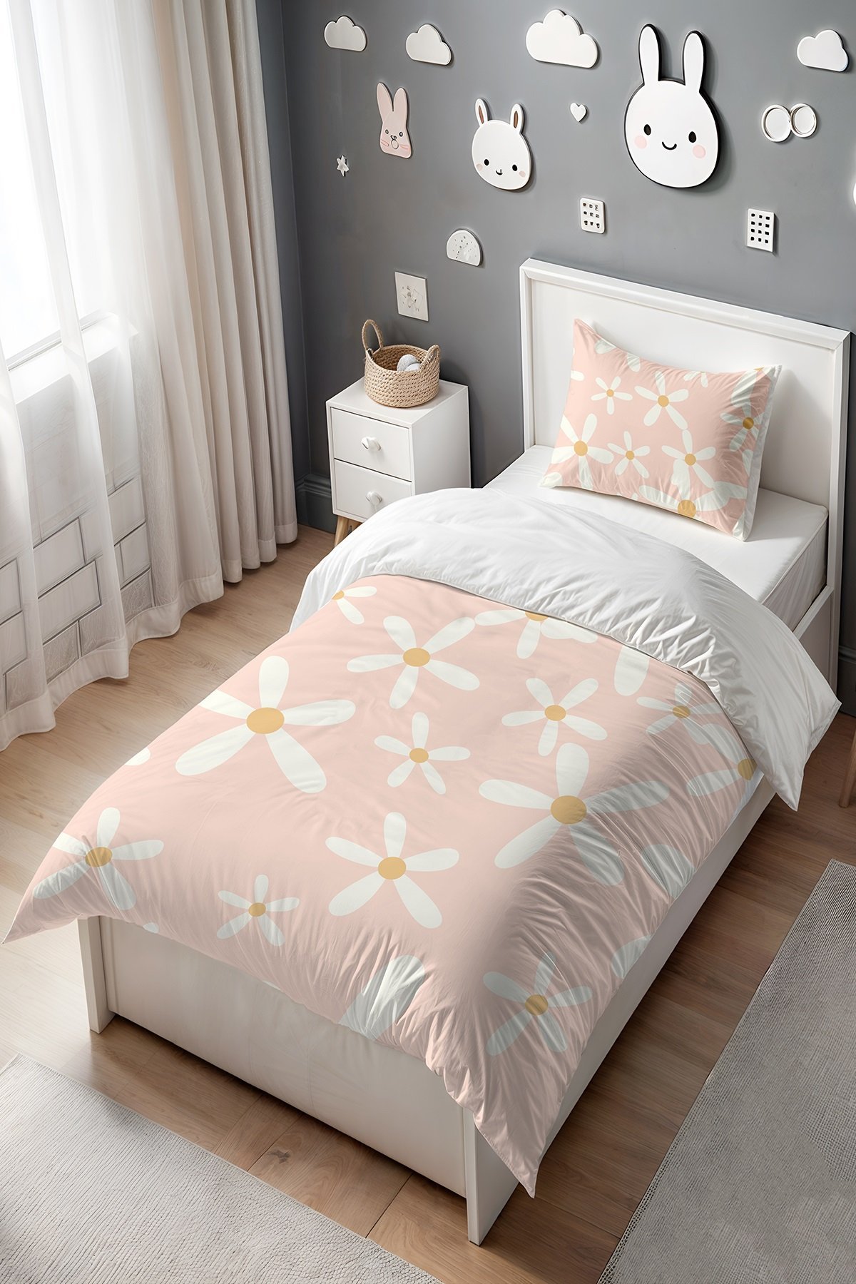 Beyaz Papatyalar Desenli Tek Kişilik Bebek Çocuk Nevresim Seti