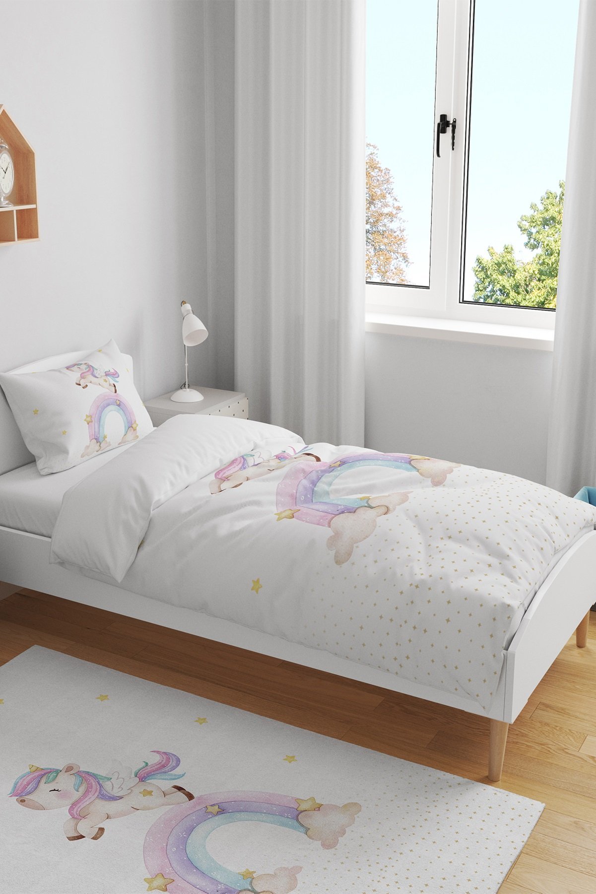 Beyaz Ponçik Unicorn Desenli Tek Kişilik Bebek Çocuk Nevresim Takımı